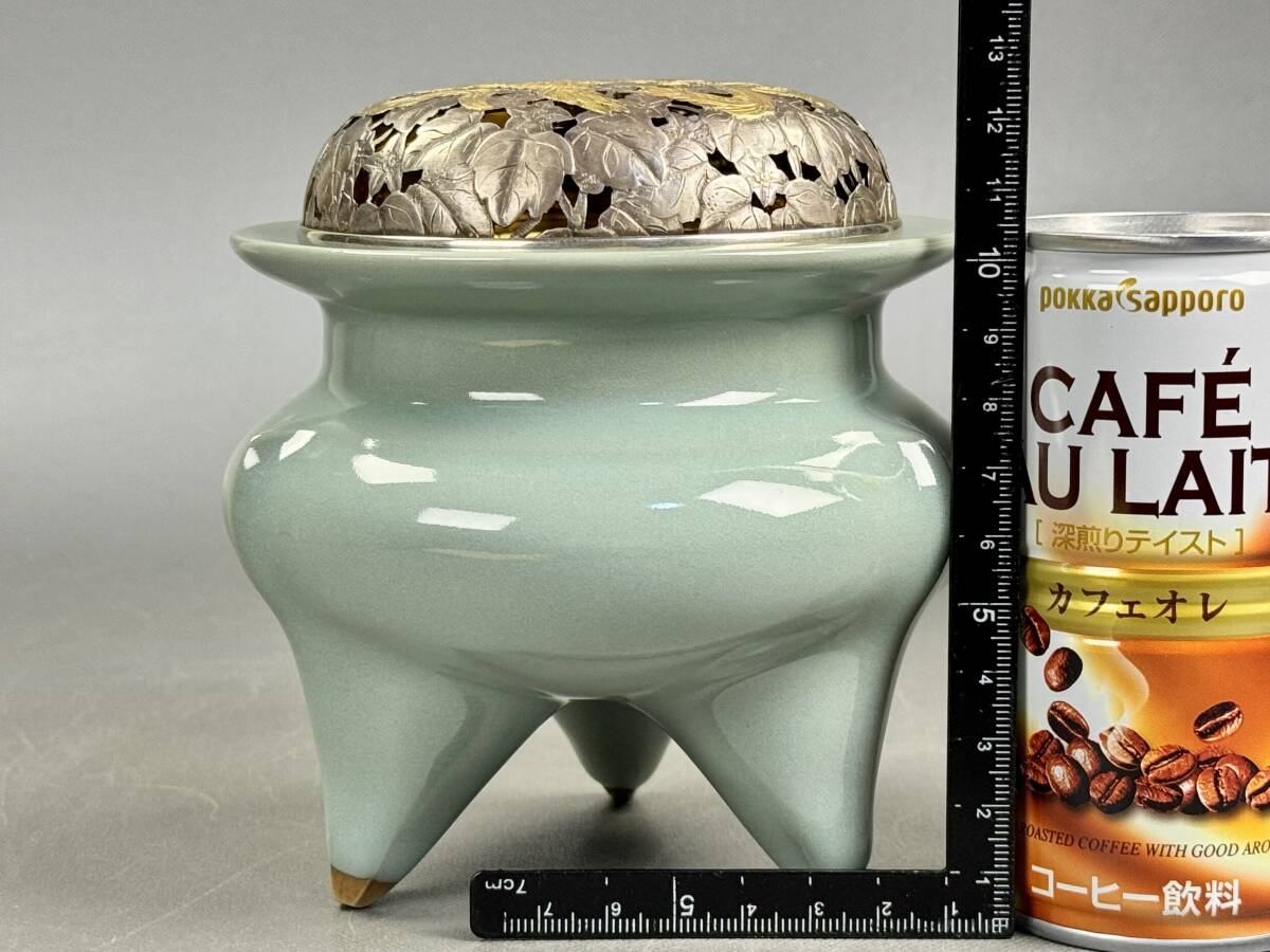 【偲】レア 三代諏訪蘇山 信幸造 青瓷袴腰香炉 純銀透彫鳳凰紋火舎 三足 香爐 共箱・二重箱付 骨董品 在銘 高さ約12.5cm 香道具 銀製 p-24