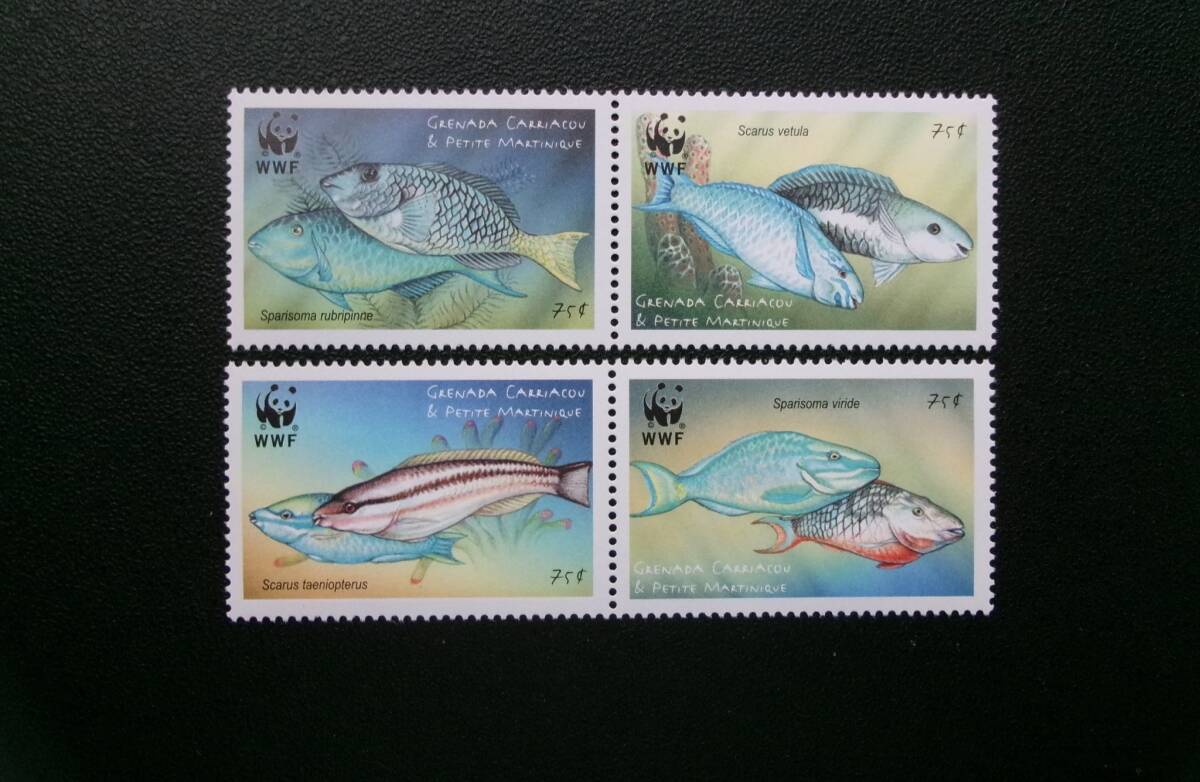 グレナダ領カリアク島・プティトマルティニーク島2001年発行 ストップライトパロットフィッシュなど世界自然保護基金切手 4種完 NH オフセット印刷 未使用美品です。