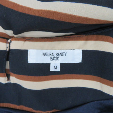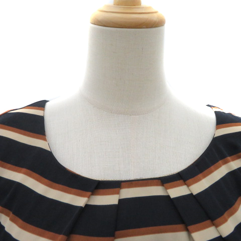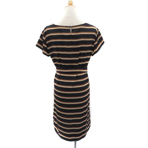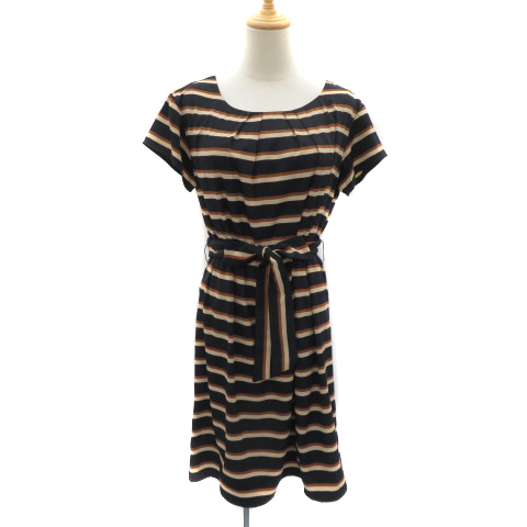 ナチュラルビューティーベーシック ワンピース ひざ丈 半袖 ウエストリボン マルチボーダー柄 M マルチカラー 黒 ブラック レディース