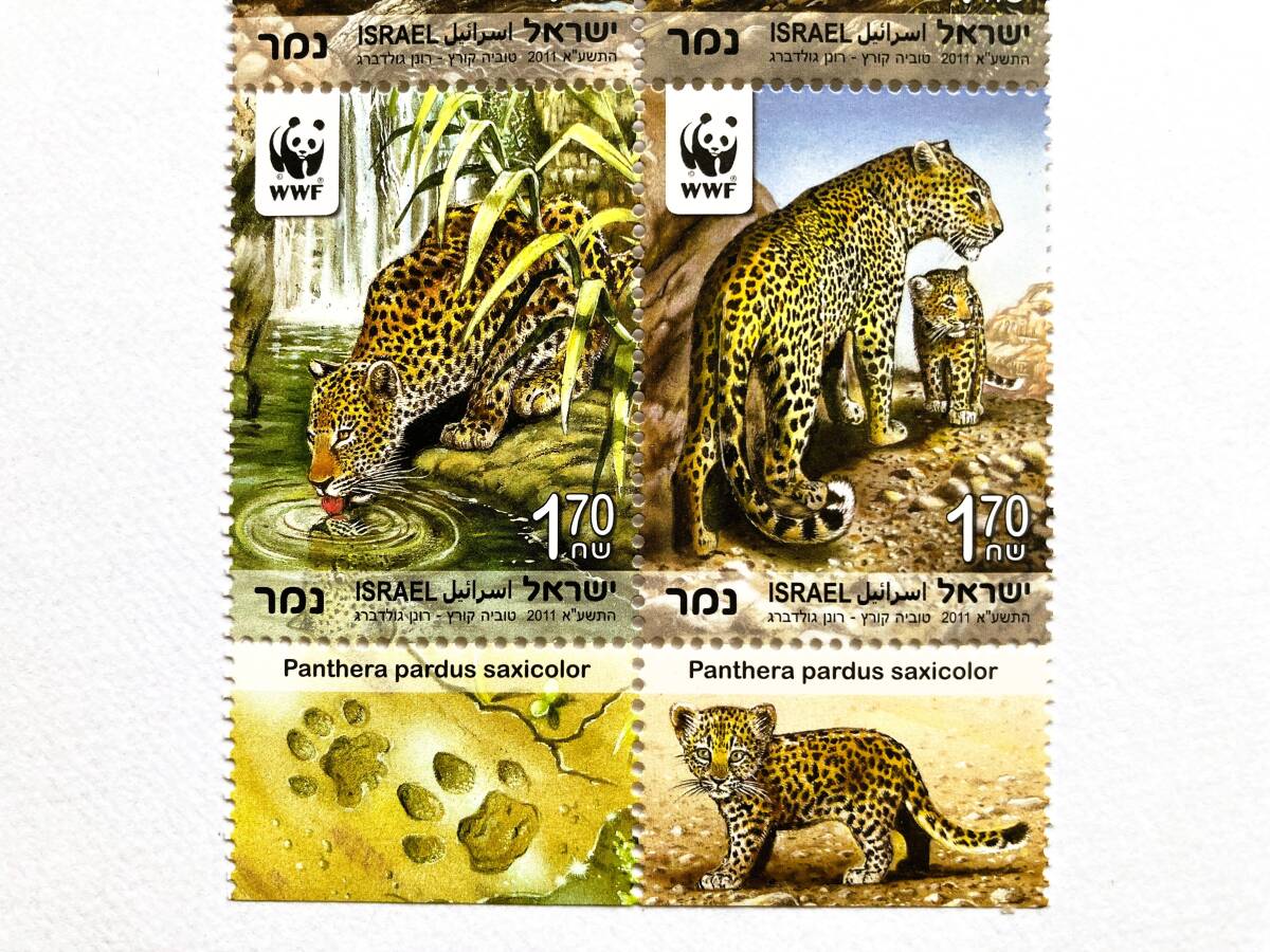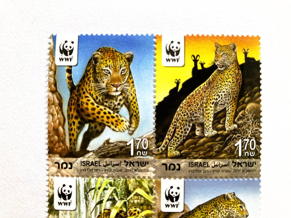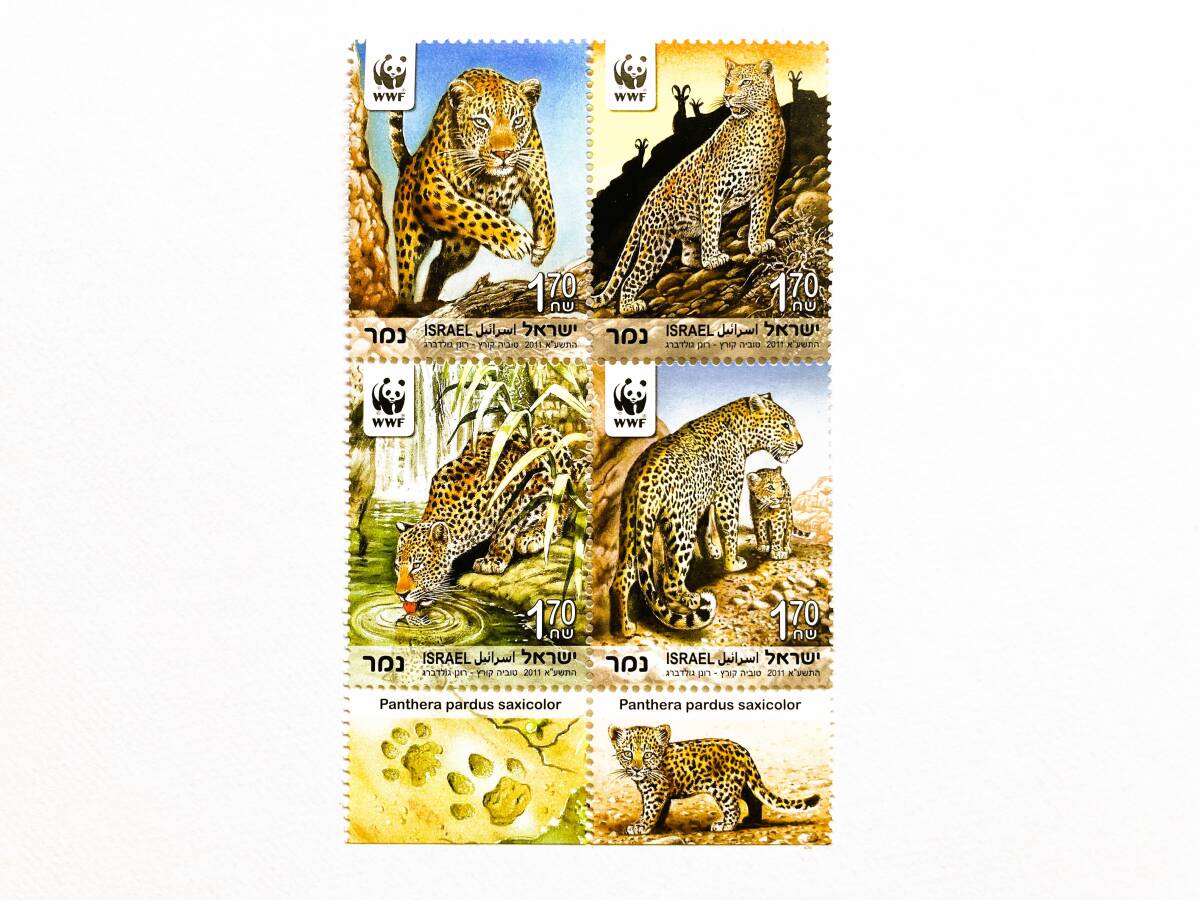 イスラエル 2011年発行  「WWF(世界自然保護基金)ペルシャヒョウ〔絶滅危惧種〕」 田型連刷 未使用、NH(ヒンジ跡無)、糊付です。