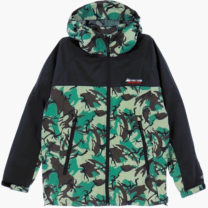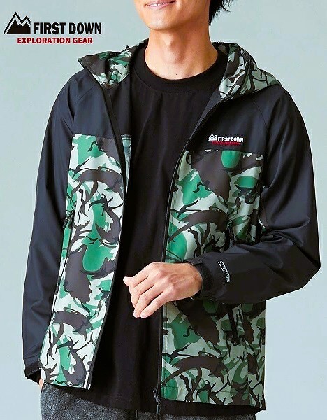 【FIRST DOWN】★撥水仕様・防花粉・超軽量・通気性★フルジップパーカー【●新品未着用タグ付き●】品番:6451603、定価:13,980円。表記サイズ:M : 胸囲ヌード88~96cm、胸囲112cm、裄丈84cm、着丈70cm。生地:ポリエステル100%。超注目:持ち運べる袋付き!