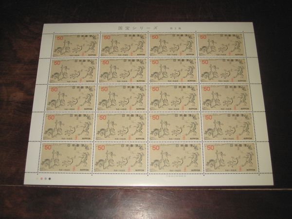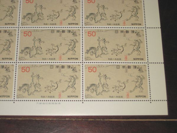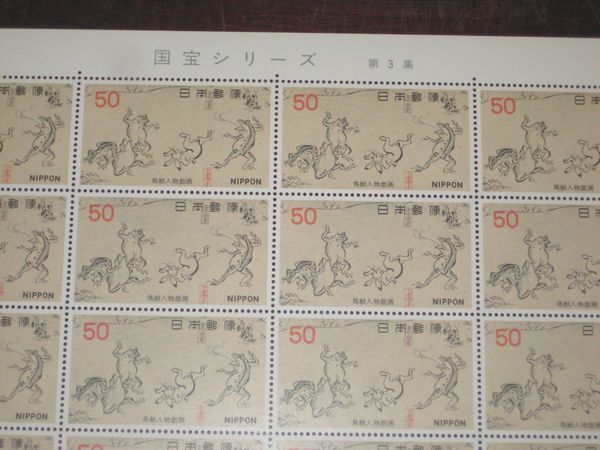 未使用 第2次 国宝シリーズ 第3集 鳥獣人物戯画(50円x20枚)1シート 昭和52年(1977年)発行。