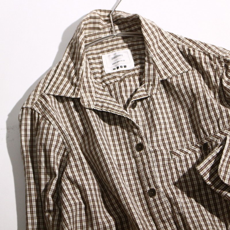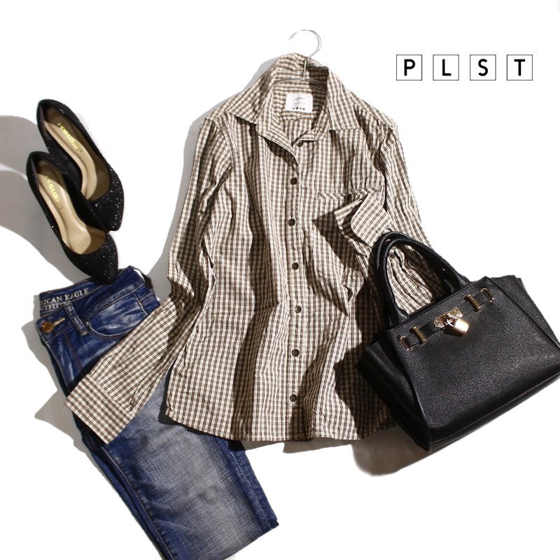 美品 セオリー Theory プラステ PLST 春 夏 チェック 柄 長袖シャツ 2 M ホワイト 白 ブラウン 茶色 シャツ ブラウス ミセス ロング お洒落