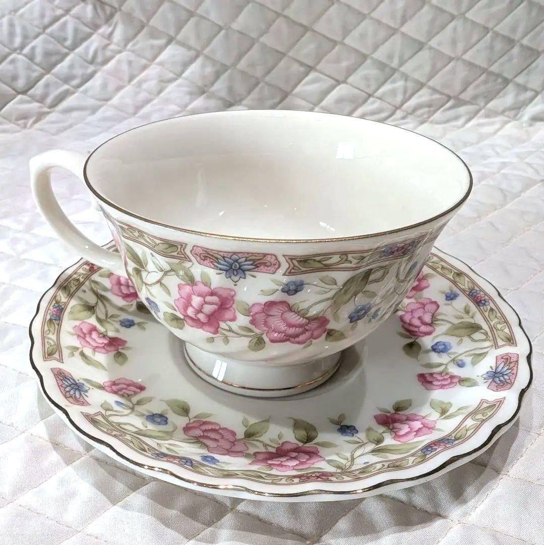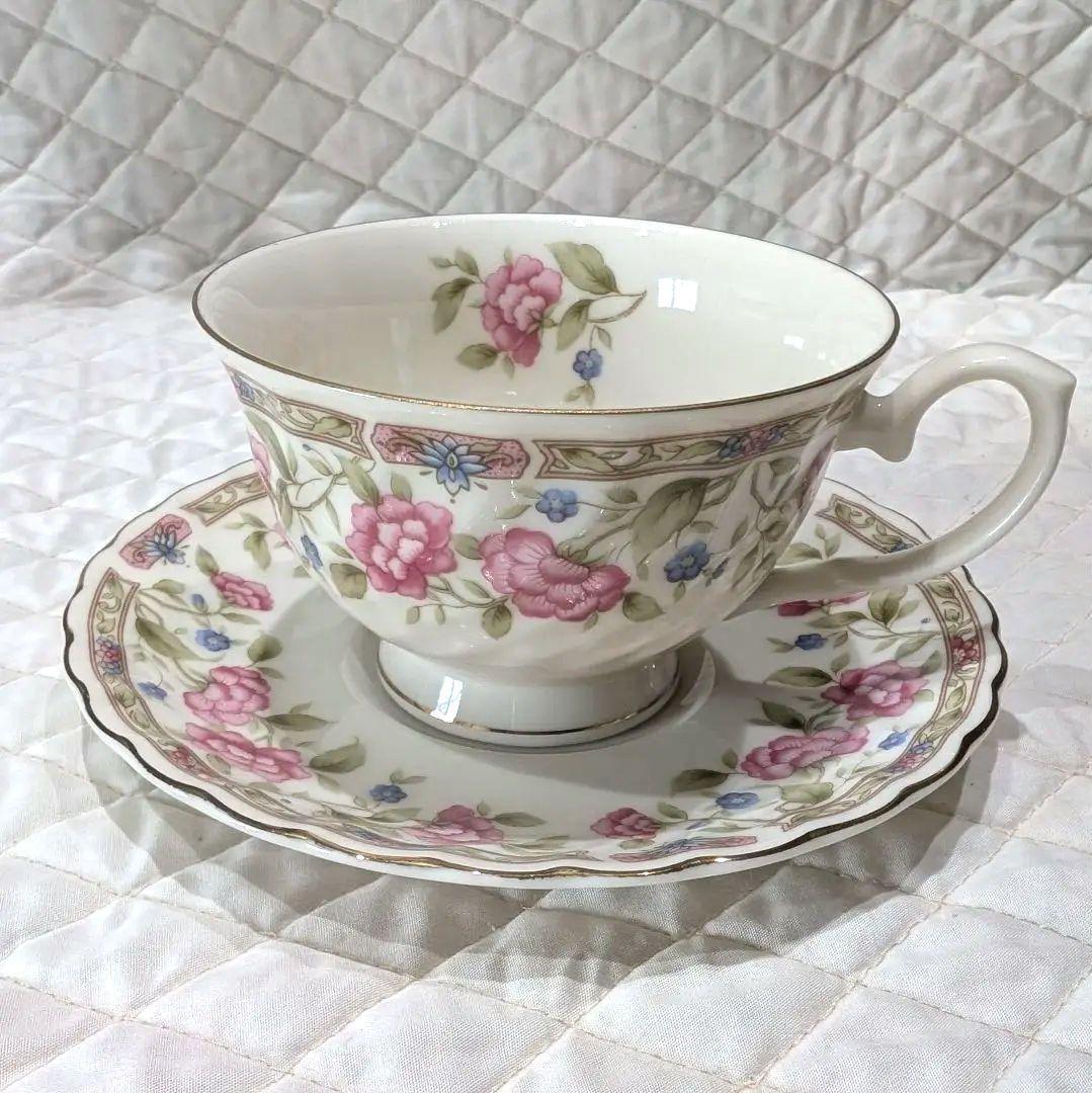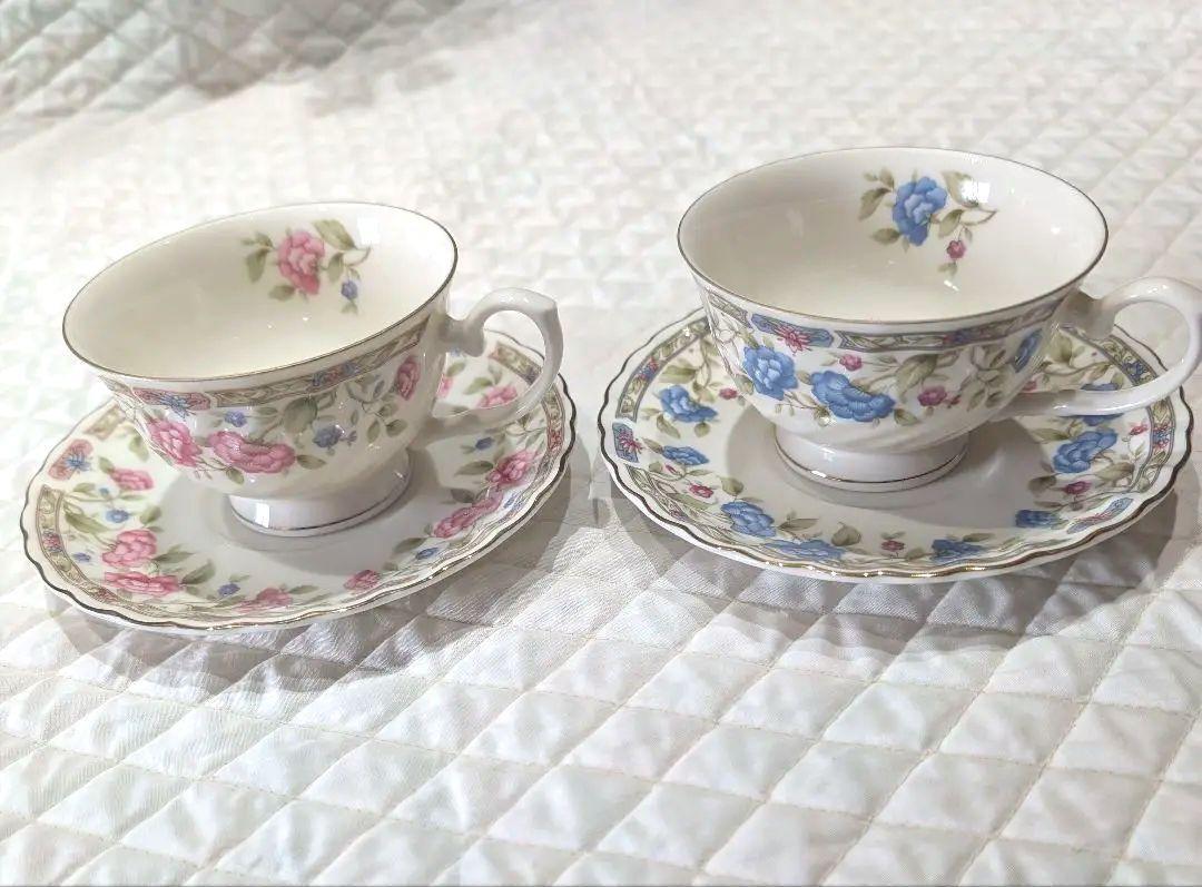 ピンクと青の花柄が美しいクラシックなティーカップとソーサーの2客セット。