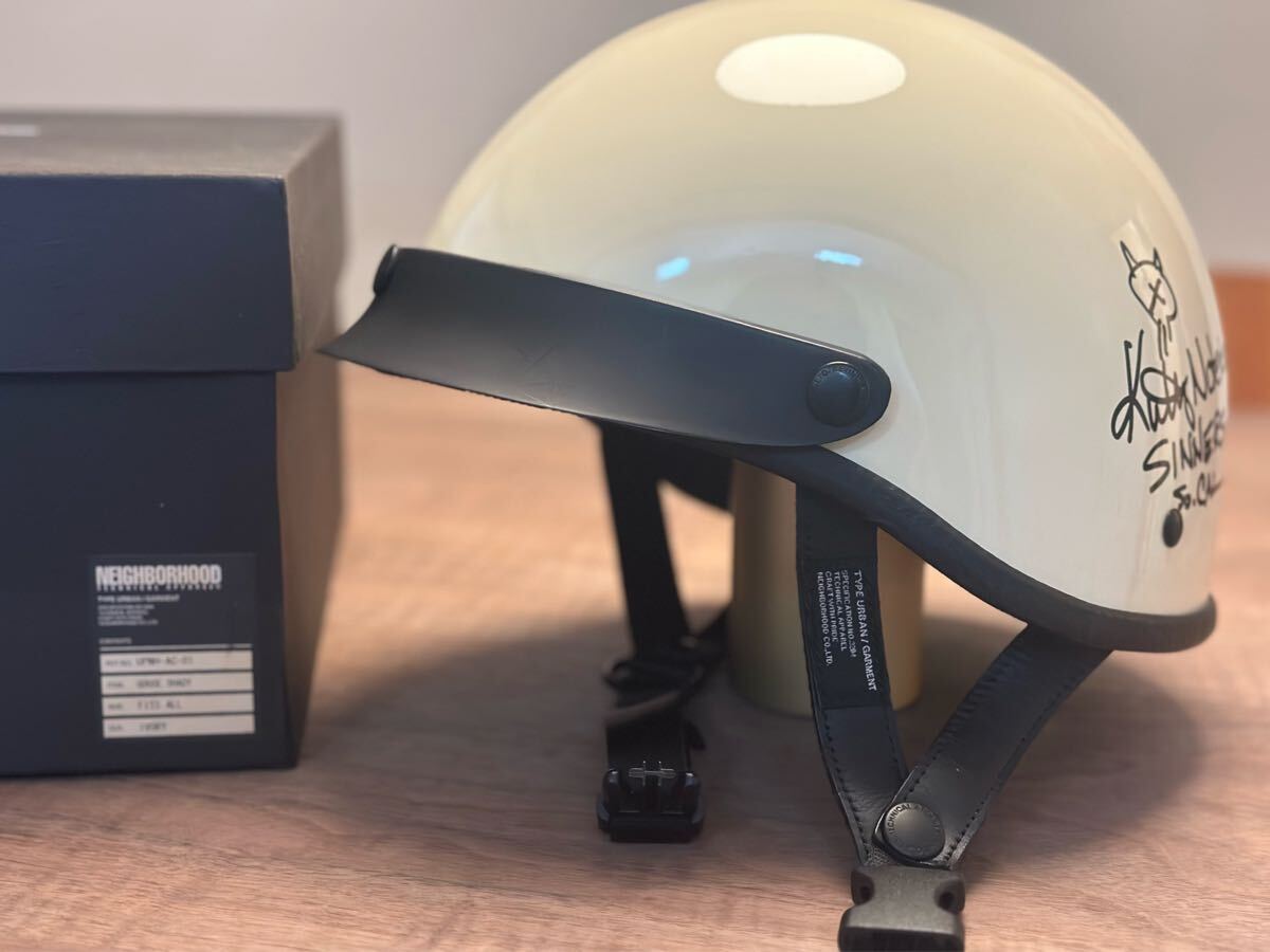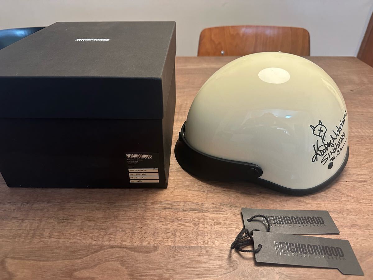 ネイバーフッド×ポーターのヘルメットです。ネイバーフッドの滝沢伸介氏とシナーズのサイン入りです。状態は非常に良いですが新品ではありませんので多少のスレ等はよく見るとありますので、ユーズドにご理解の無い方は入札をお控え下さい。FITS ALLとの記載ですがだいたい59センチ前後かと思います。デザインは画像にてご判断下さい。飾っておこうかと思いましたが探されてた方がありましたらご検討ください。発送はゆうパック着払いです。ノークレーム、ノーリターンでお願いします。