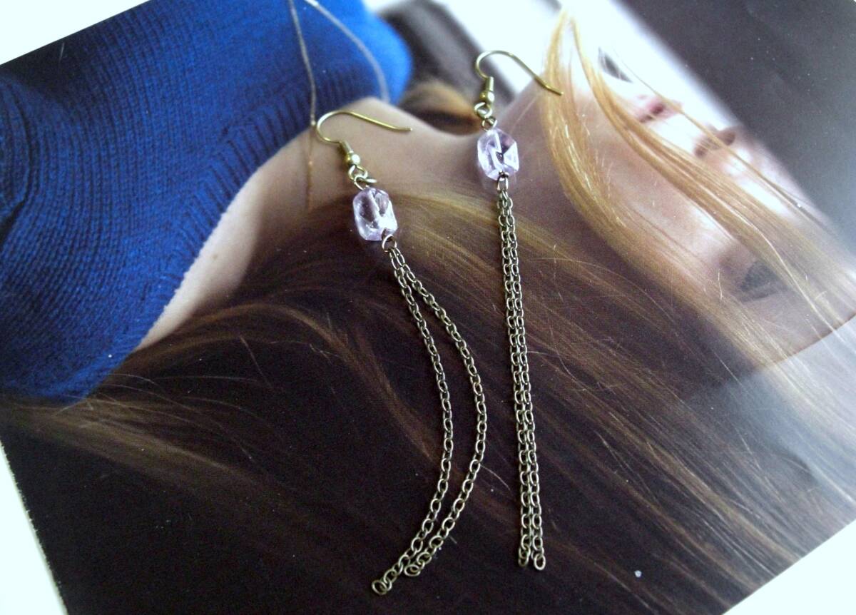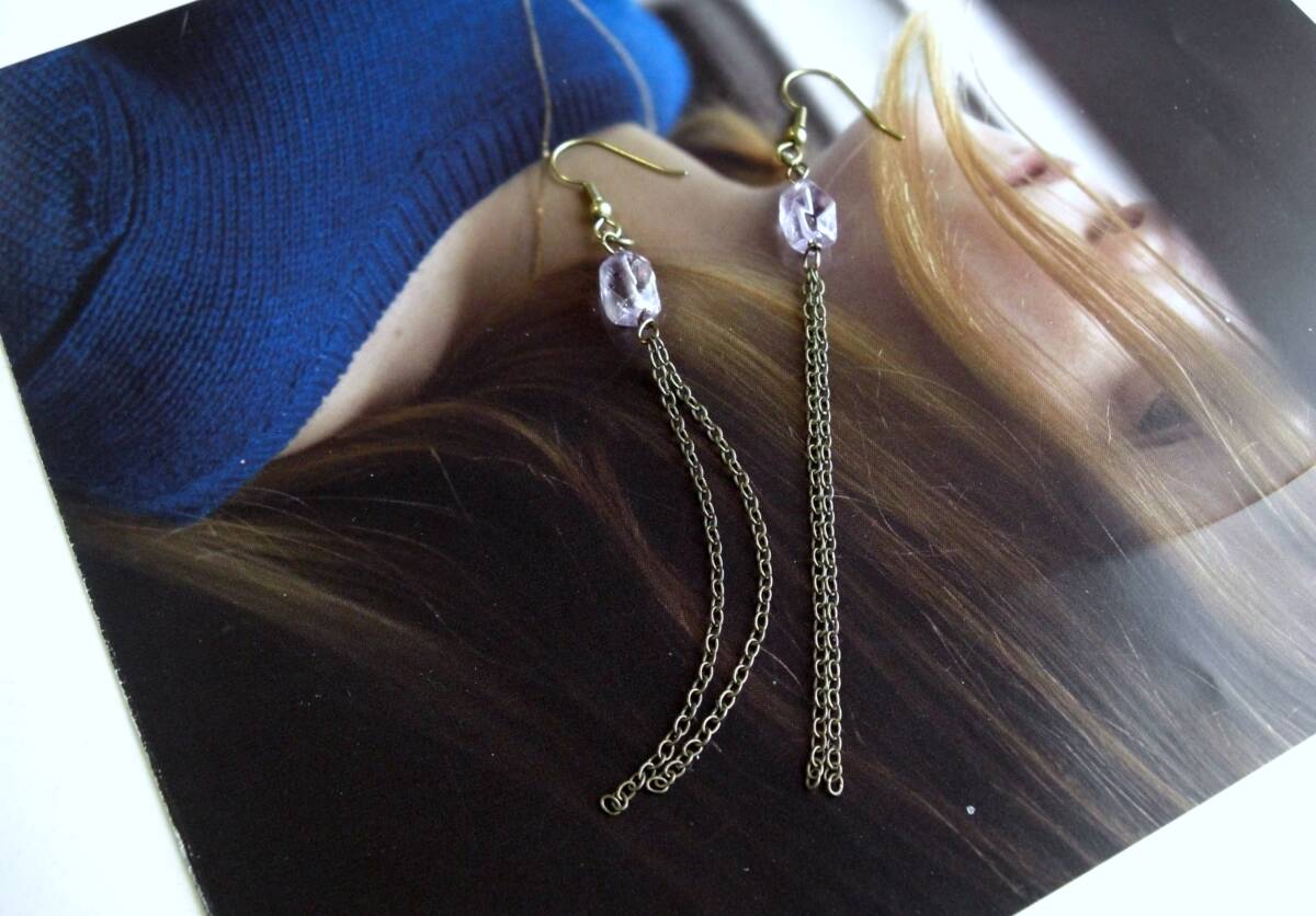 透明度の高いラフ・カットのアメジストは可憐な表情と存在感があります♪8ミリ位のアメジストに華奢なチェーンを合わせました♪長さは全長11センチ位です♪イヤリングに変更も可能です♪お揃いのシリーズも出品しています♪ハンドメイドをご理解いただいてノークレーム、ノーリターンでお願いします。