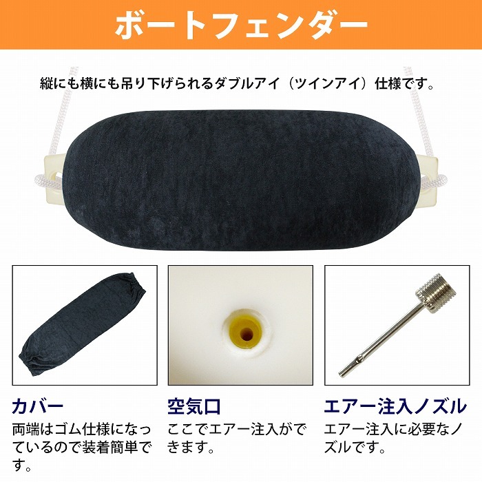 【送料無料】『3種×1セット』ボートフェンダー 580×190mm&黒カバー&ロープ 黒 2m 船 浮き ブイ フロート 係留ロープ