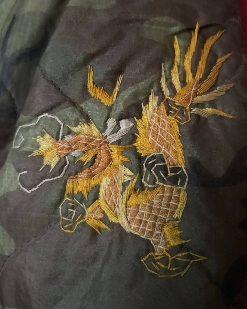 刺繍もヴィンテージにしてはほとんどほつれもなく驚くべきコンディションではあるのですが、ただ一点、裏地のライナーが交換されずにオリジナルのままなのでこちらはシミや焼けが目立ちます。 スカジャンやベトジャン、ヴィンテージのスーベニアジャケット好きな方には承知の上で気にならないとは思いますが念の為しっかりと記載しておきます。