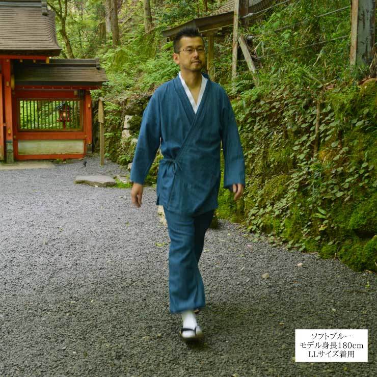 生地は薄手で軽いので動きやすい作務衣です。普段着はもちろん作業着、寝巻、パジャマ、部屋着にも最適です。夏祭りなどでも活躍間違いなしです。年中ご使用いただけるという事で和食店・飲食店・居酒屋・整体院・陶芸家・書道家など多岐に渡りユニフォームとしてご利用いただいております。作務衣は上下ゆったりとしているので作業をするにも窮屈感なく動作ができます。人気の作務衣スタイルをカジュアル感覚で気軽に楽しんでいただけるデニム仕立て作務衣。インディゴブルーとソフトブルーの2色から選べます。デニム仕立て作務衣は洗うたびに愛着が湧いてきます。綿のしなやかさと肌触りはとても良いので女性にも最適に着用していただけます。お値打ちだからと言って決して生地が悪いわけではございませんのでご安心ください。裾がゴム仕様なので外の作業も汚れる心配がありません。また熱が逃げにくく、保温性が高いのも特徴。
