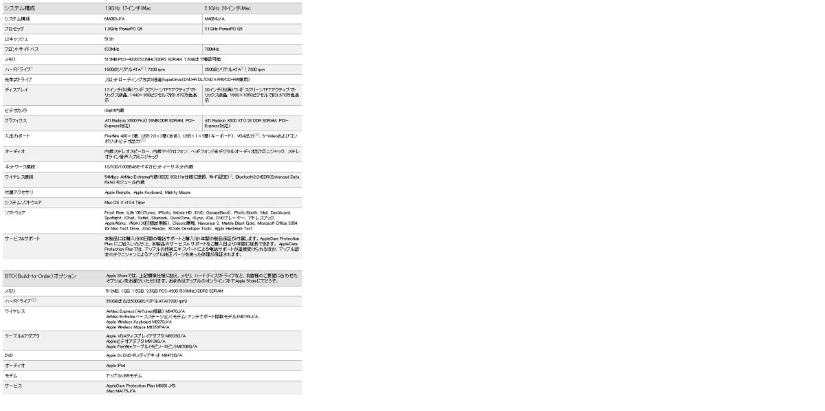 2004年後半に発売されたiMac G5のモデルで、主なスペックは以下の通りです。 (スペック表より抜粋)
