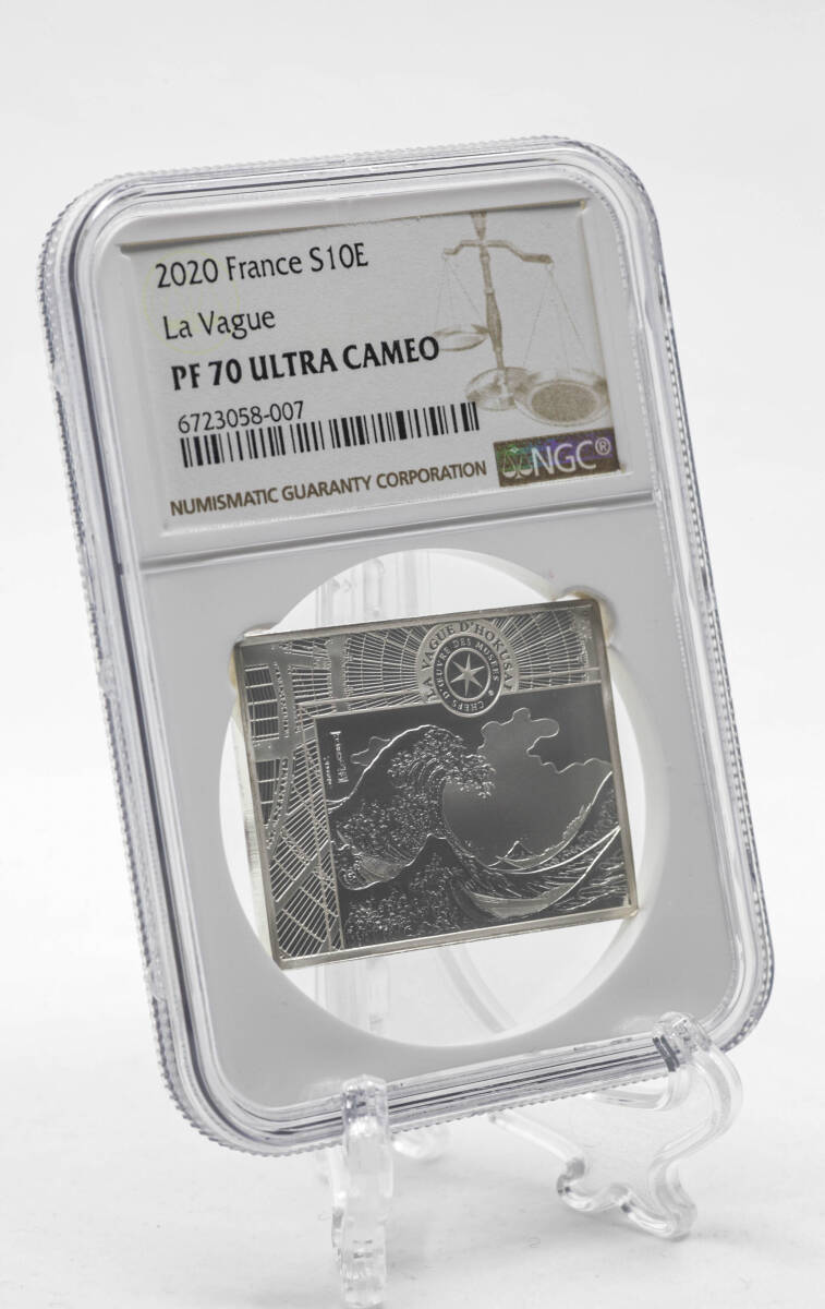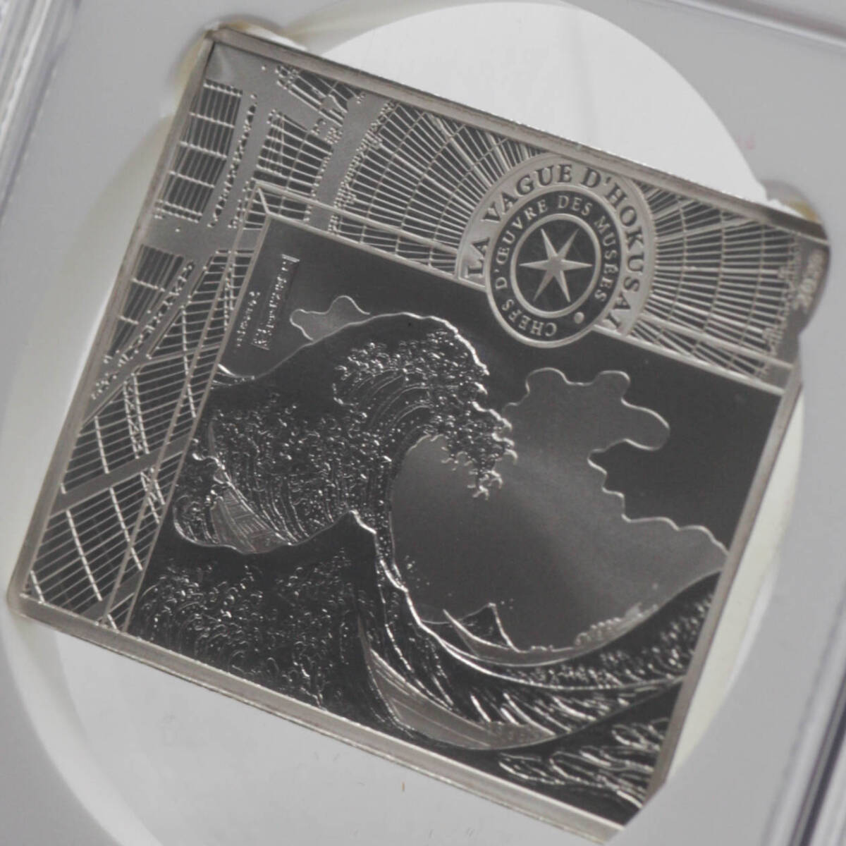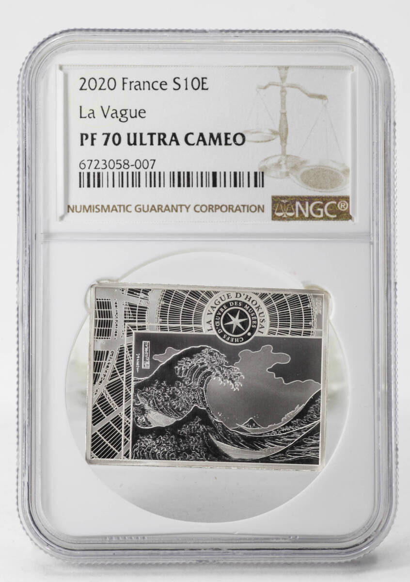 ・日本の名画「神奈川沖浪裏(葛飾北斎)」をモチーフにしたデザイン ・フランス造幣局「CHEFS-D'OEUVRE DES MUSEES」シリーズの一枚 ・ユニークな長方形フォルムが魅力 ・最高鑑定 PF70、かつNGC鑑定済1枚のみという希少性! |