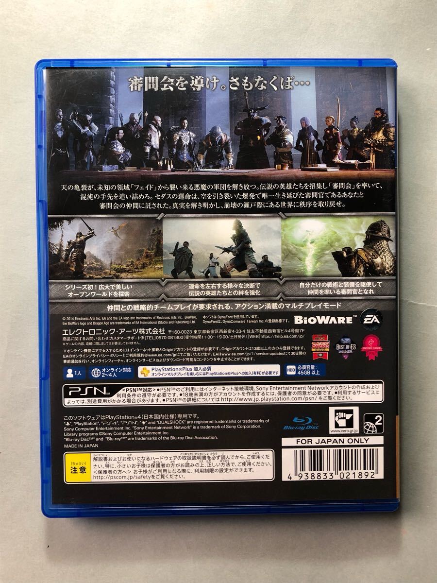 PS4ソフト ドラゴンエイジ:インクイジション「審問会を導け。さもなくば・・・」エレクトロニック・アーツ/バイオウェアです。ケースに擦れ、細かな傷、線傷、線状や点状のへこみ跡があります。ディスクのデータ読み取り面に目立つ傷や汚れなくきれいです。起動、動作確認済みです。写真のモノが全てです。新品をお探しの方や神経質な方の入札はご遠慮下さい。ノークレーム・ノーリターンで、お願いします。入札よろしくお願いいたします。 C06-407-061007
