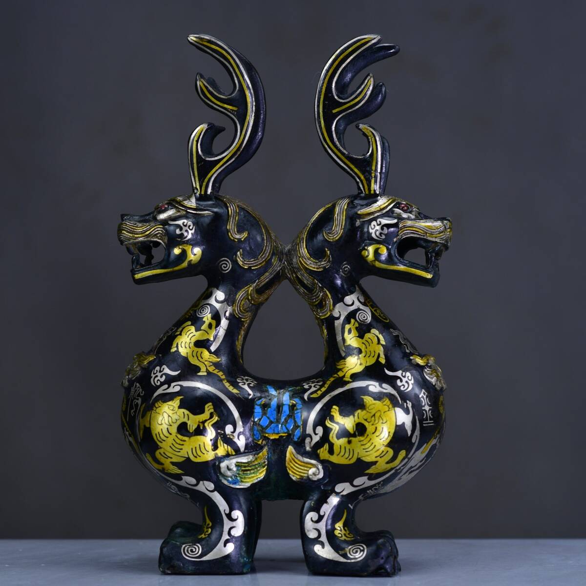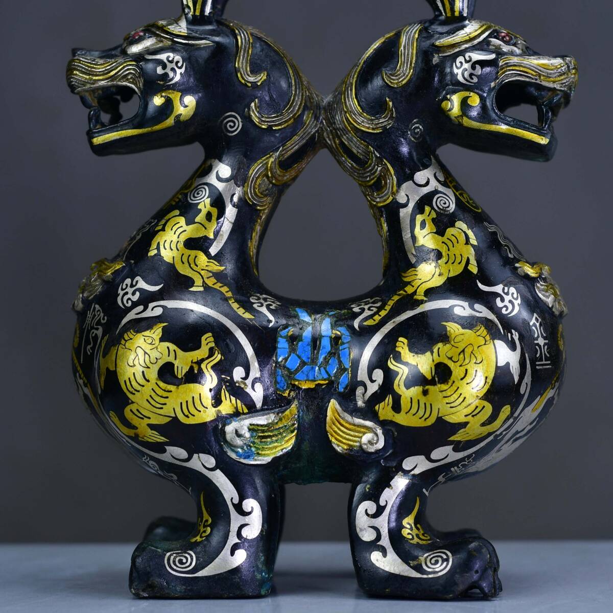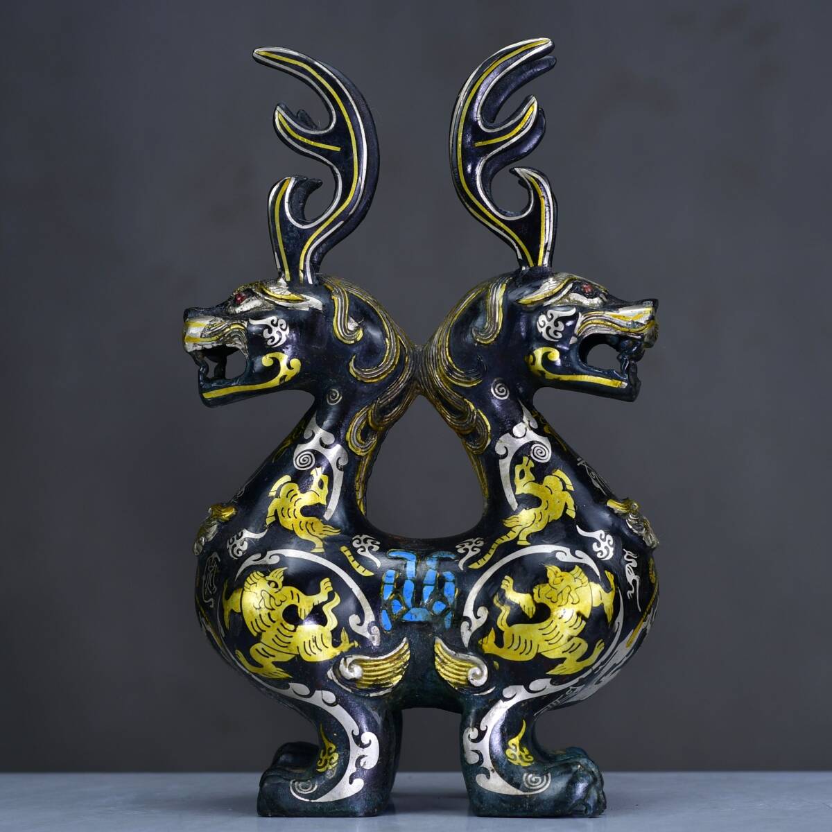 青銅器 旧蔵 商周時代 漢代青銅モザイク錯金銀双頭瑞獣 銅製 唐物 收蔵品 時代物 古美術 古置物 希少珍品 供養品 文房具 極細工6.11