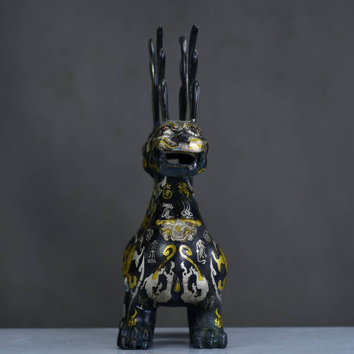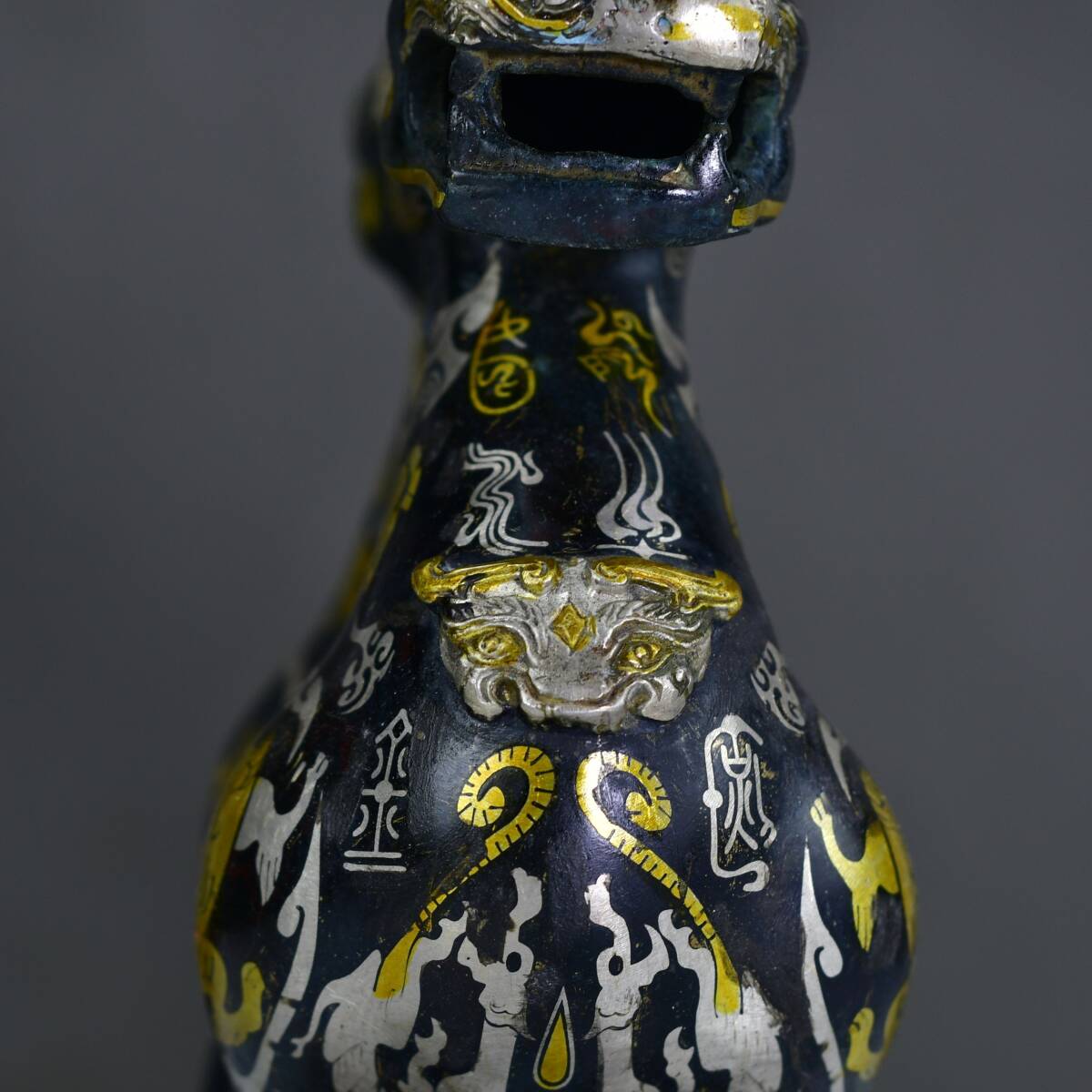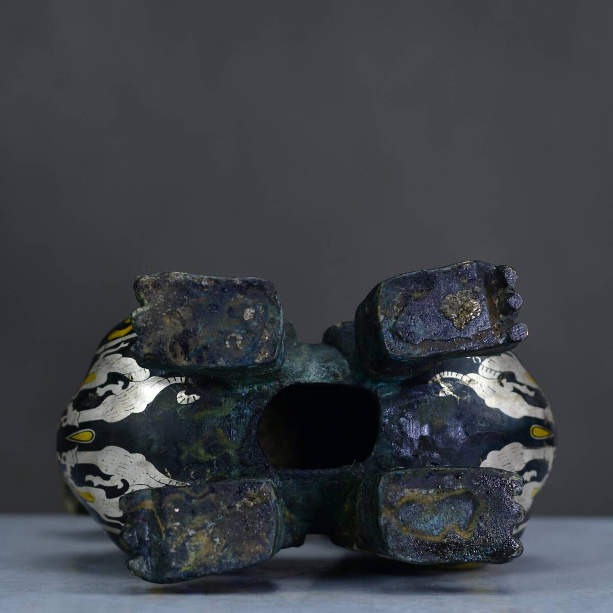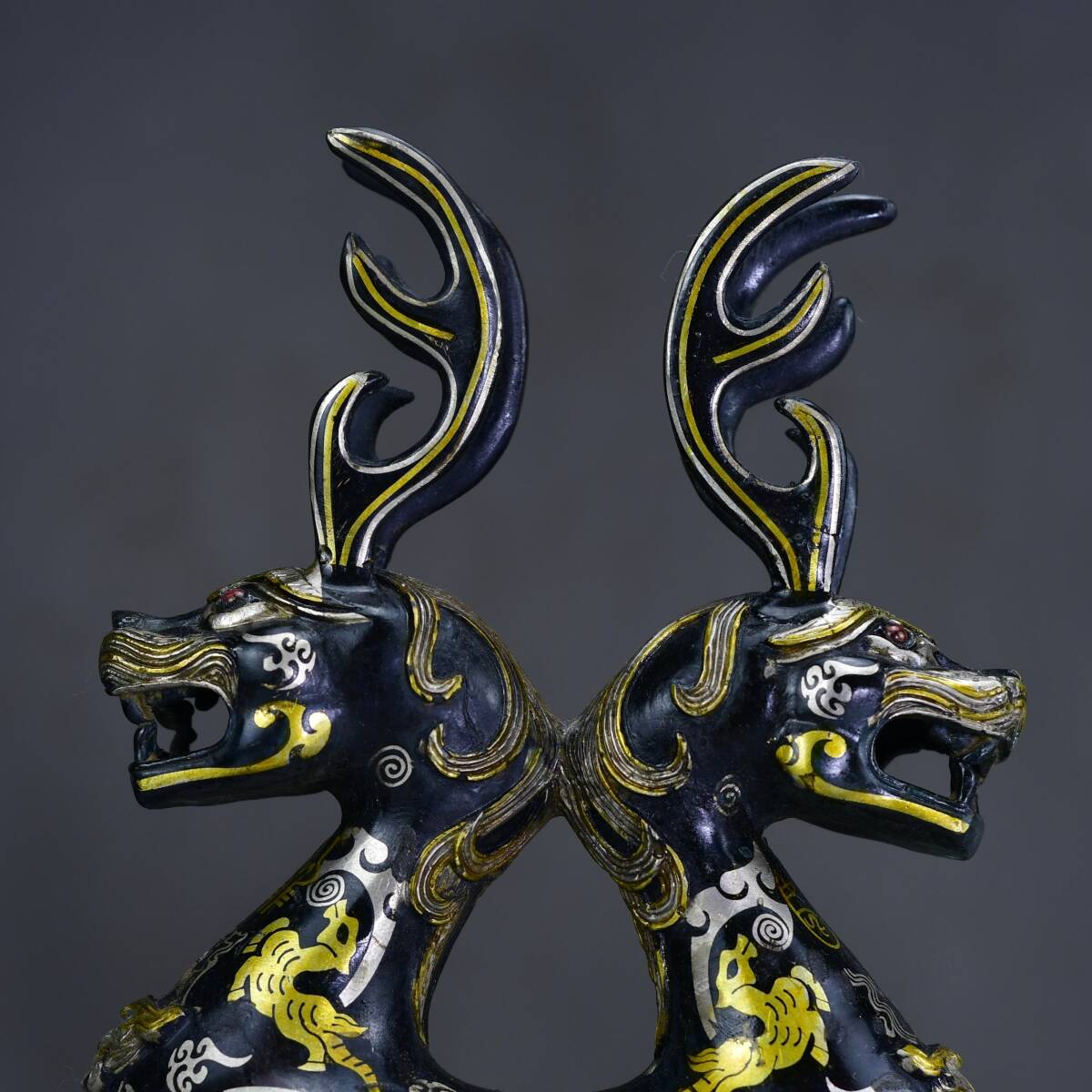 青銅器 旧蔵 商周時代 漢代青銅モザイク錯金銀双頭瑞獣 銅製 唐物 收蔵品 時代物 古美術 古置物 希少珍品 供養品 文房具 極細工6.11