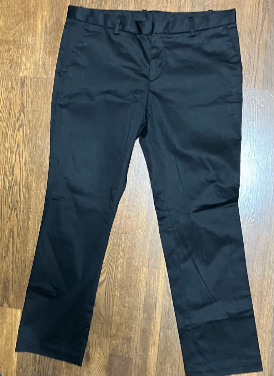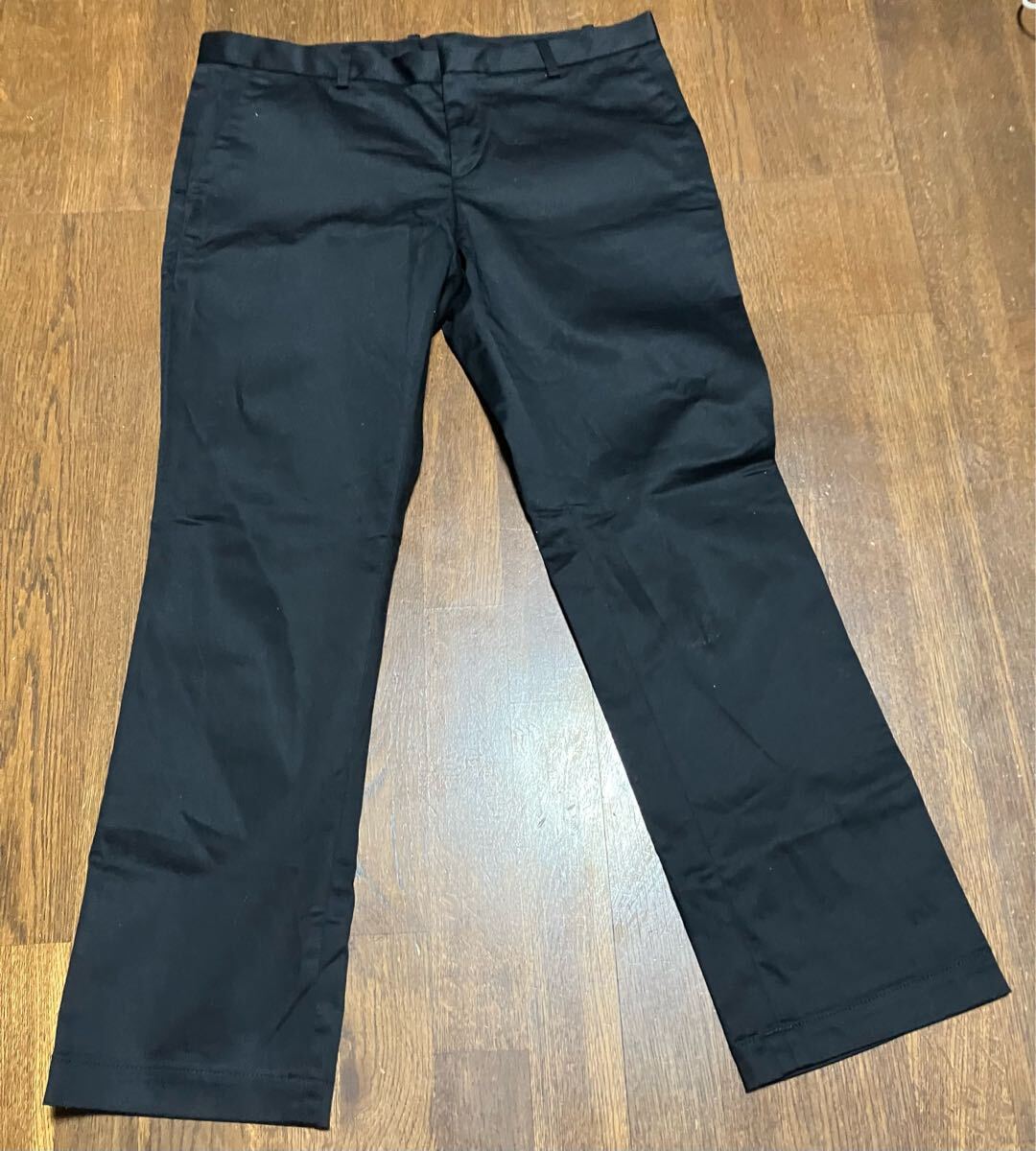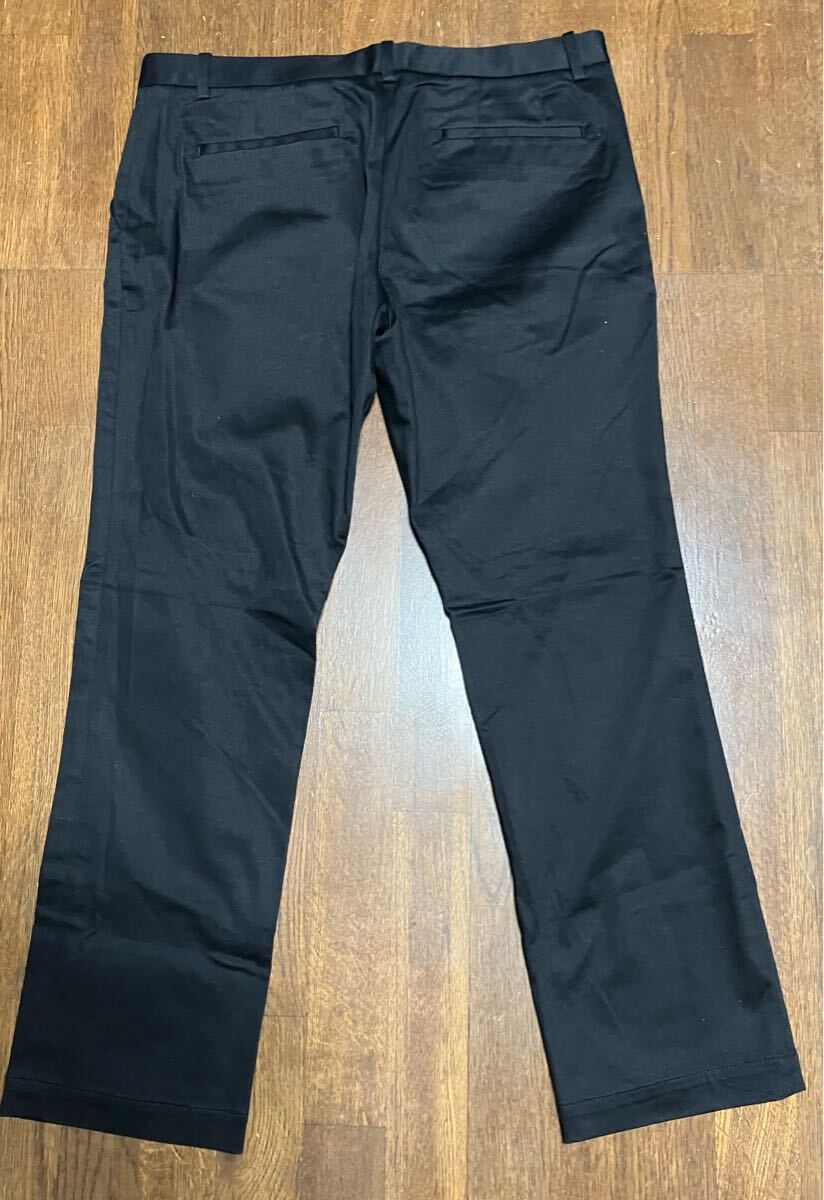 シンプルなデザインの黒スラックス、ストレートフィットでビジネスシーンにも最適。
