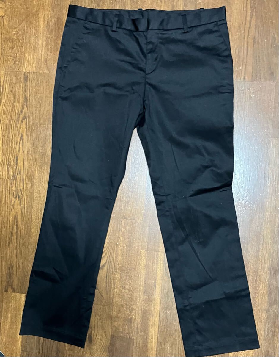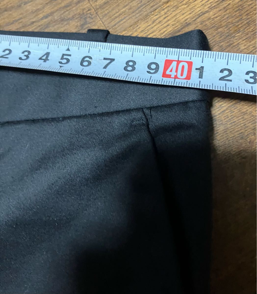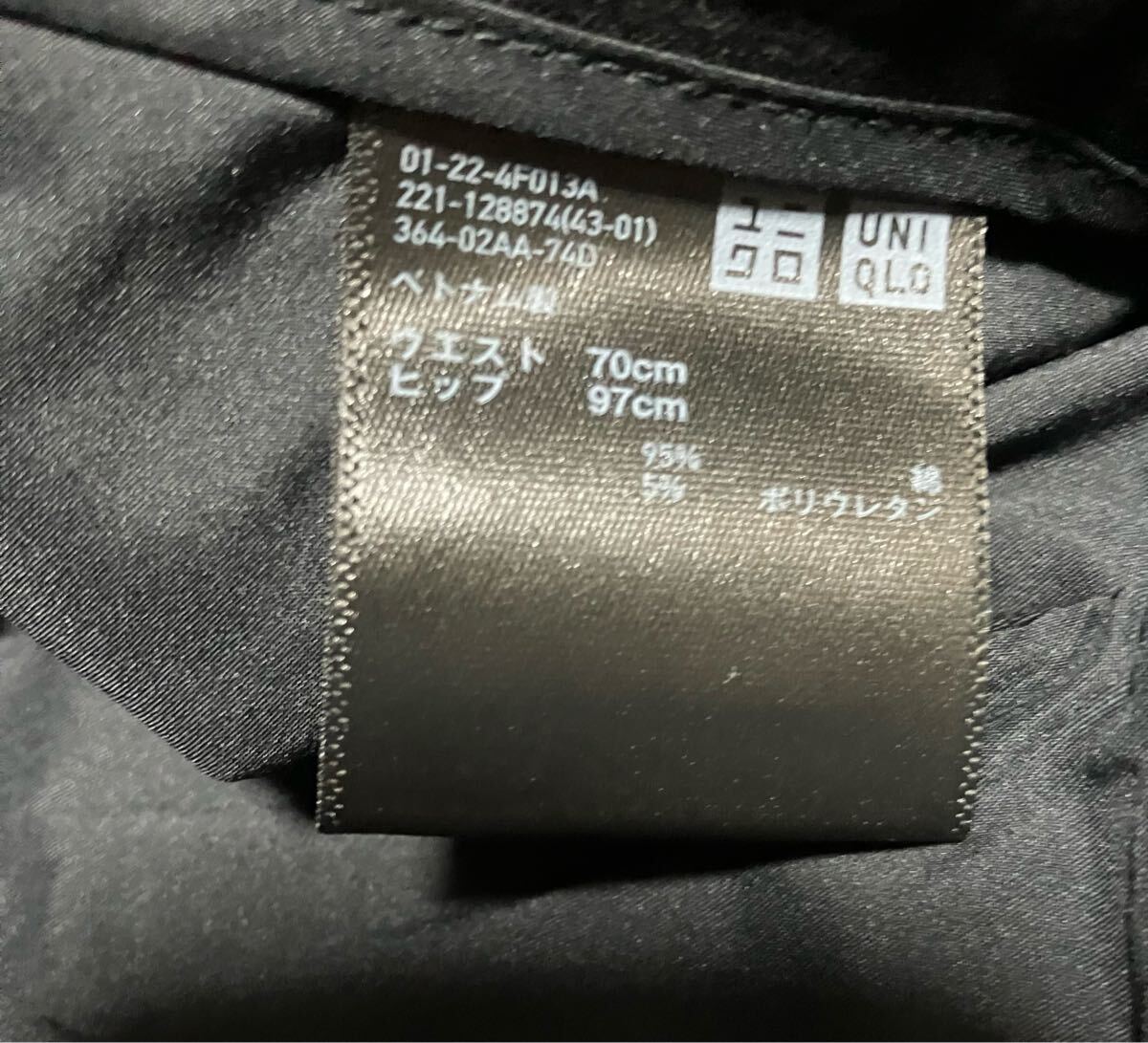 シンプルなデザインの黒スラックス、ストレートフィットでビジネスシーンにも最適。