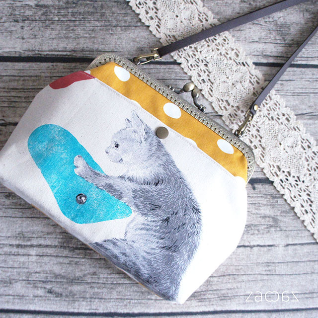 ボルダリングをする子猫の生地ポケットにを使ったがま口バッグです。