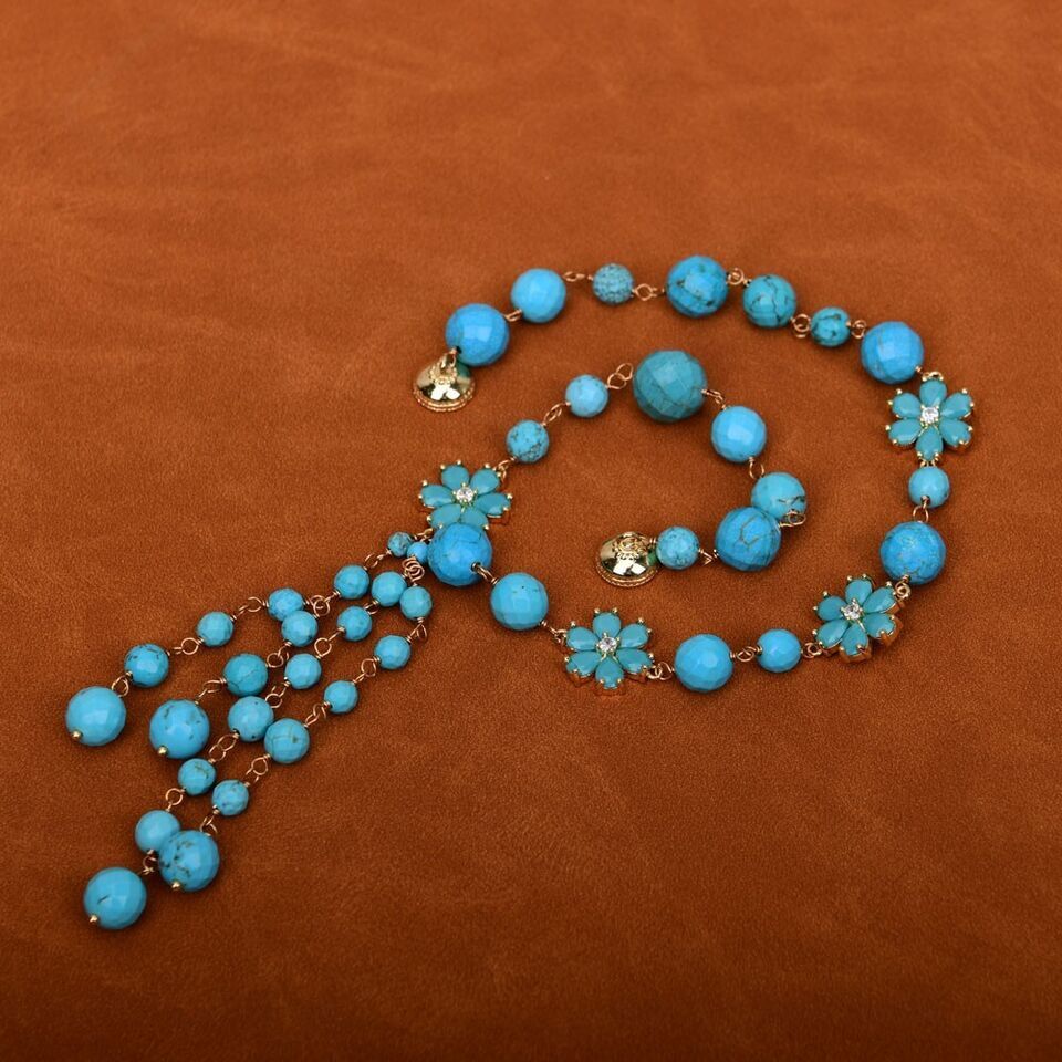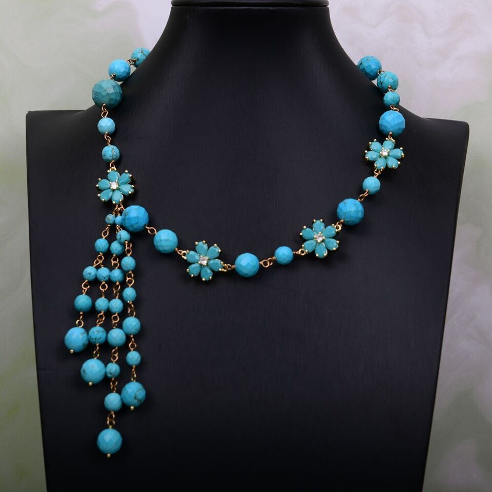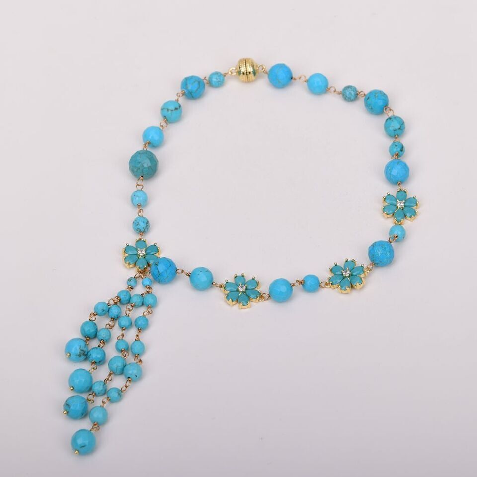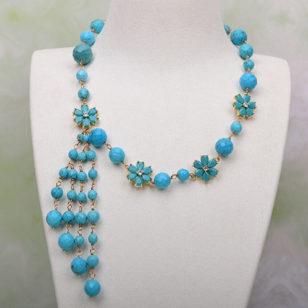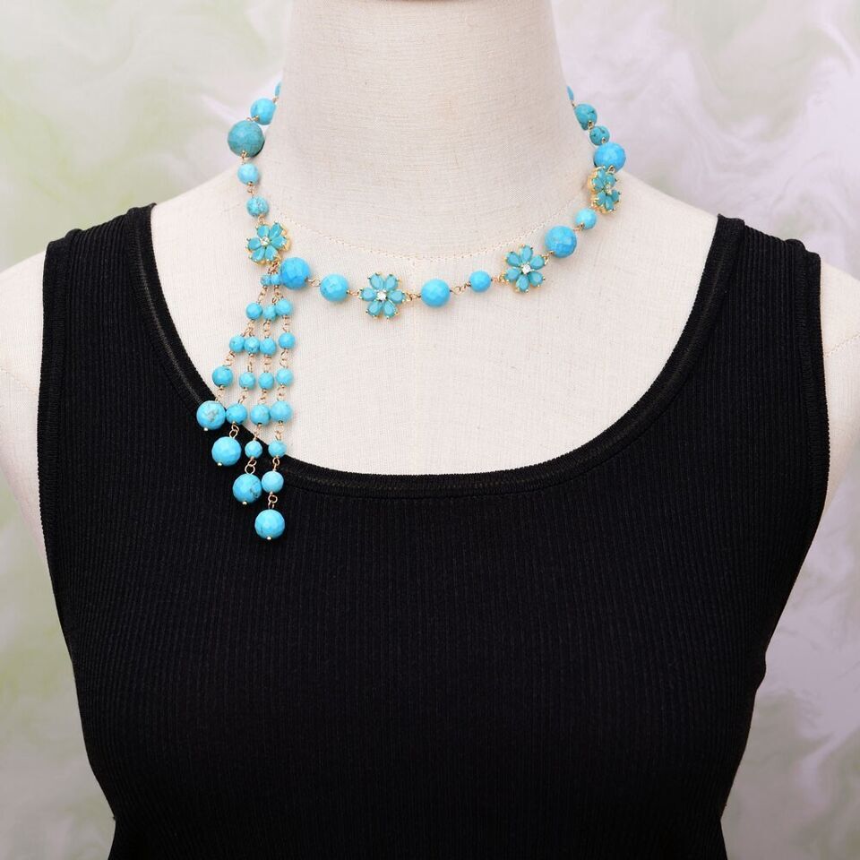 <新品>天然 ターコイズ トルコ石 ブルー ジェイド フラワー 17.5インチ ネックレス プレゼント パーティー