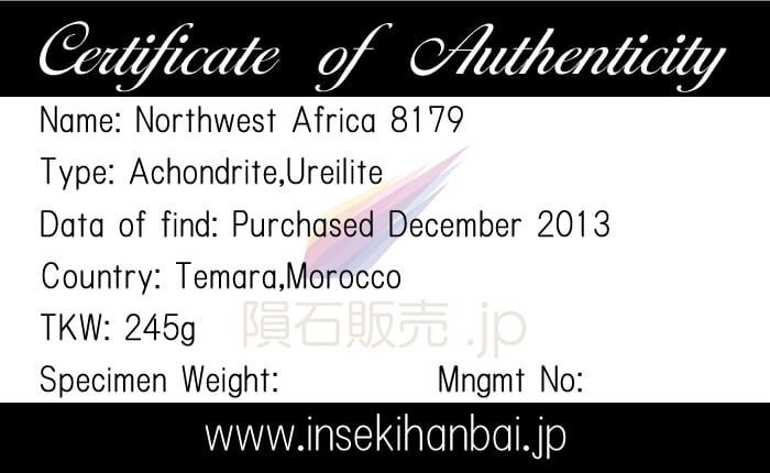 正式な隕石名はNorthwest Africa 8179です。2013年12月にモロッコ北西部にあるテマラの隕石マーケットでAdamAaronson氏が総質量245gの塊を購入した後、アメリカにあるUWS(University of Washington、Department of Earth and Space Sciences)にサンプルを送りA.Irving氏とS.Kuehner氏が分析・分類したことで正式に登録されました。ワシントン大学に20gが寄託されており残りの200g以上はAdamAaronson氏が所蔵しています。