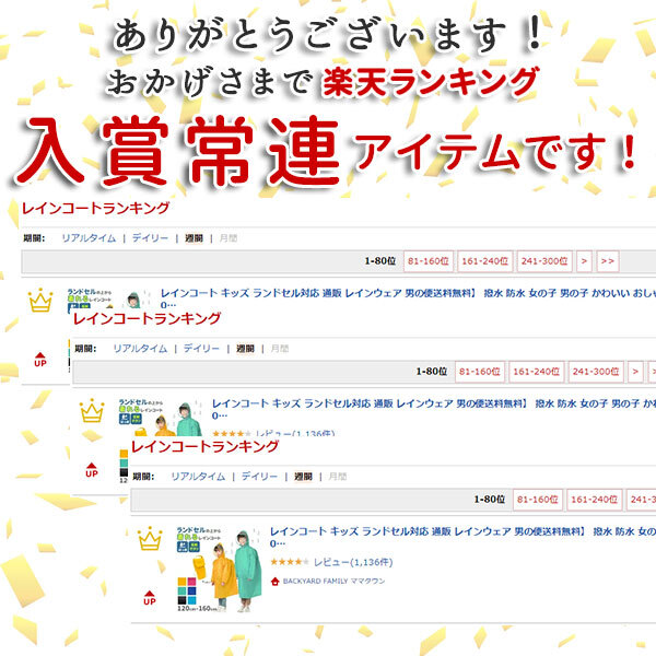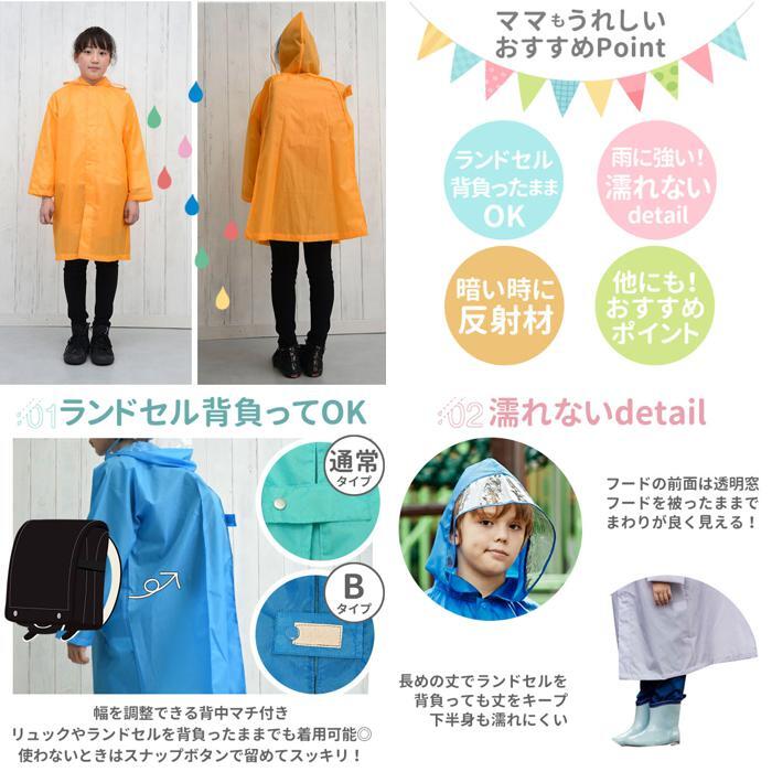 | 商品説明 | ・・虹をイメージした豊富なカラー展開と、実用性抜群の機能をご紹介します。 1.フードには透明ひさし付で、視界良好。 2.ポケットにはフラップ(ふた)が付いていて雨水がレインコートを伝ってポケットに入るのを軽減します。 3.背中マチ付きでランドセルやリュックの上からでもゆったり着用して頂けます。 4.前ポケット・背中タブ部分に反射材を採用。 5.ランドセルにそのまま取り付けられる、収納袋付き。 など、充実の機能が沢山。機能面も充実で色違いで揃えたくなるとご好評頂いているランドセルコートです。 |