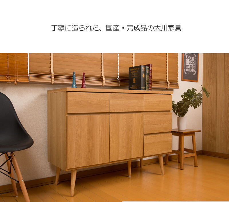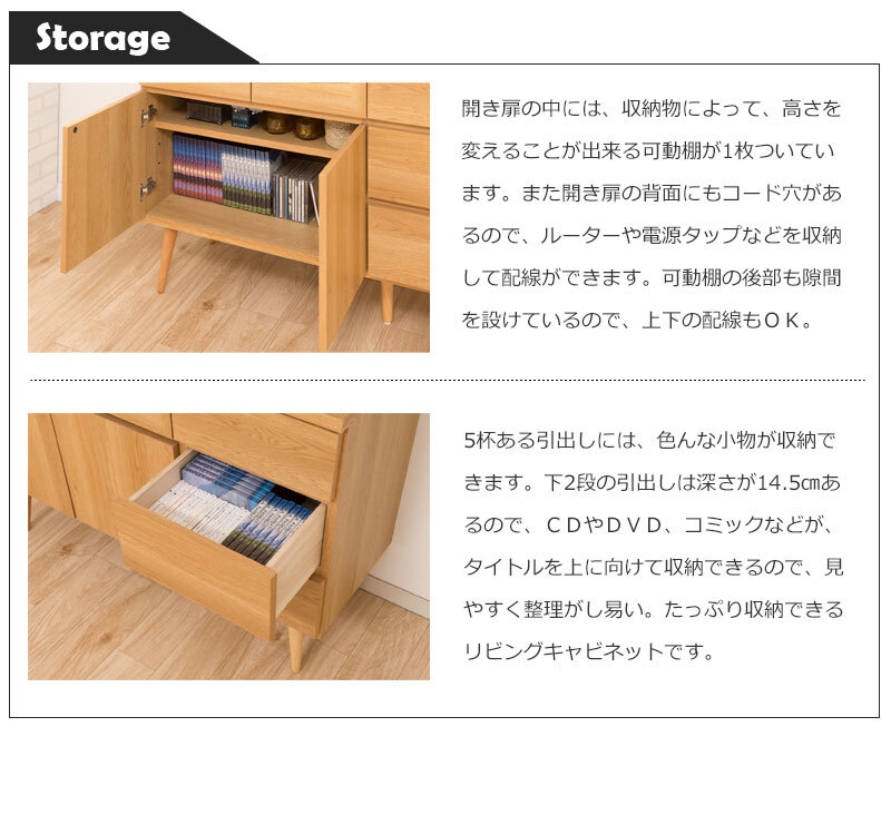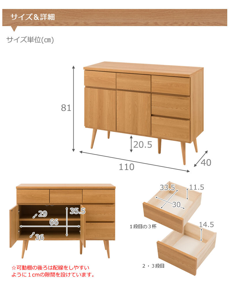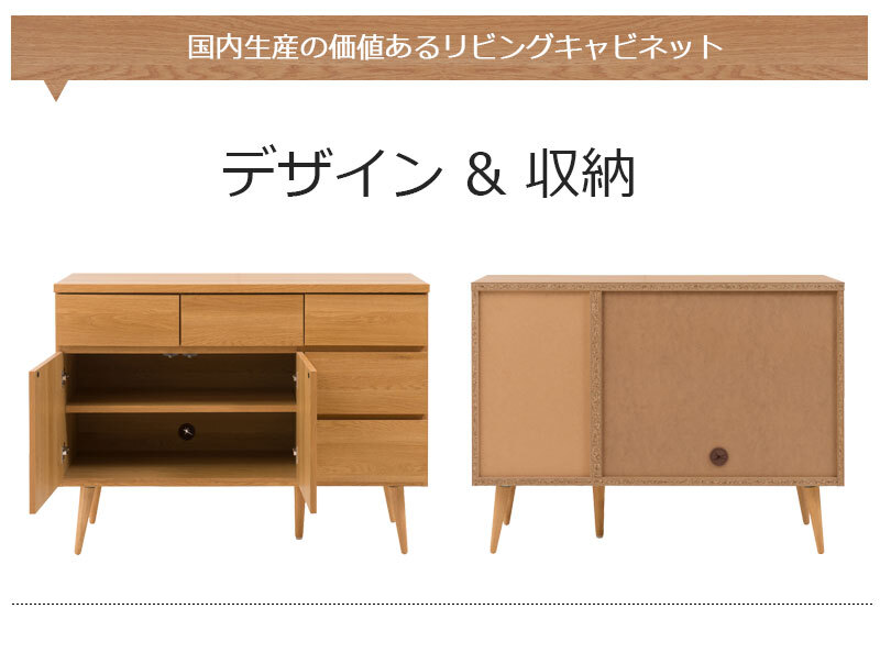 ■商品について/小ぶりでありながら、存在感があるのは脚のシャープ感と本体のボリュームが生む絶妙なバランス。軽やかな印象の小ぶり感はいろいろなタイプと組み合わせてお洒落な雑貨が映える空間を演出。 この「バランス」がどこか新しさを感じる、ずっと眺めていたいそんな気持ちにさせてくれる。テレビキャビネットはリビングダイニングでソファからでも見やすいミドル高さに設定。ボードとしてリビングのあらゆるものをしまっておくのに大活躍。取っ手のないプッシュ式扉がすっきりとデザイン性もアップ。掃除も楽な高めの脚付きで、おしゃれ。■商品の仕様/本体:(約)幅110×奥行40×高さ81(脚20.5含む)cm■扉内寸/(約)幅66×奥行36×高さ35.5cm■引出内寸/(約)幅30×奥行33.5×深さ(浅)11.5(深)14.5cm■扉内コード穴付き■引出しストッパー付き■耐荷重量/天板:(約)20kg、棚板:(約)5kg■商品重量/(約)26kg■日本製■完成品(脚部のみ取り付け)※送料無料・送料込みの記載がある商品でも、北海道・東北・九州・離島・沖縄にお住まいのお客様は別途送料が かかる場合がございます。お見積もりはお気軽にお問い合わせください。※大型商品(ベッド・マットレス・大型家具)をお買い上げの際に、トラックが横付けできないような狭い道を手運びで配達する場合や、エレベーターが無いマンション等への2階以上への階上げは、別途追加料金が発生いたしますのでご了承ください。※配達経路をよくご確認くださいますよう宜しくお願い申し上げます。商品の梱包サイズにつきましてはお気軽にお問い合わせください。※ベッド、マットレスや大型家具の配達に関しましては、配達前にドライバーよりお電話やSNSにてご連絡をさせていただく場合がございます。配達ご希望日がご希望通りにならない場合もございますので予めご了承ください。※運送会社とお客様との配達連絡確約後のご不在、及び連絡不通の場合で再配達が余儀なくされた場合、再配達料及び商品保管料が発生いたします。