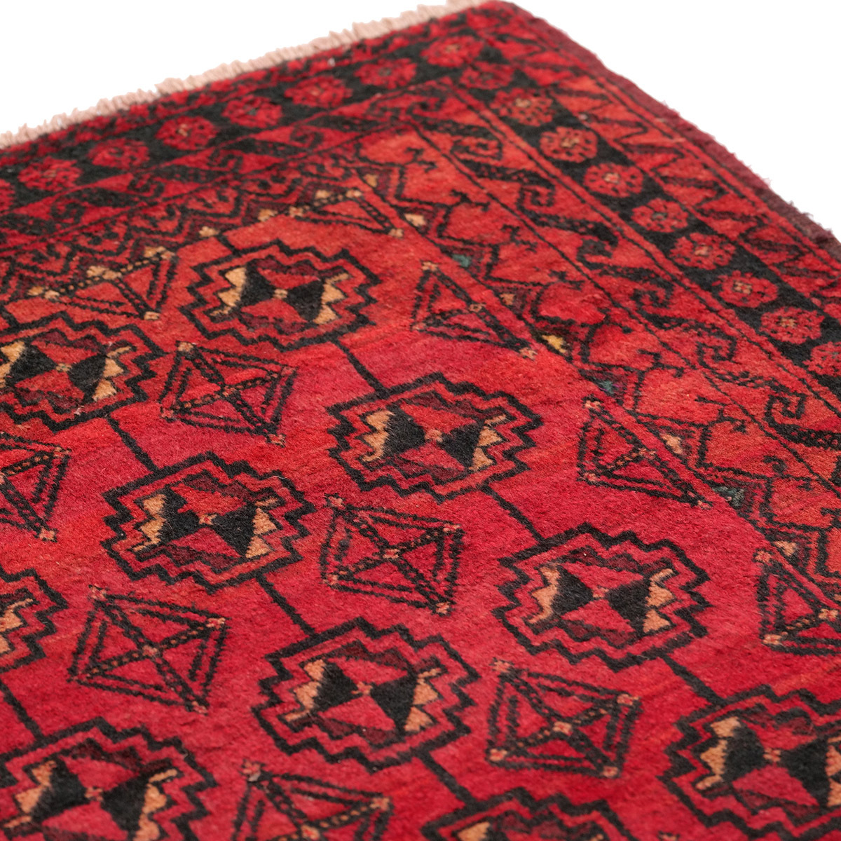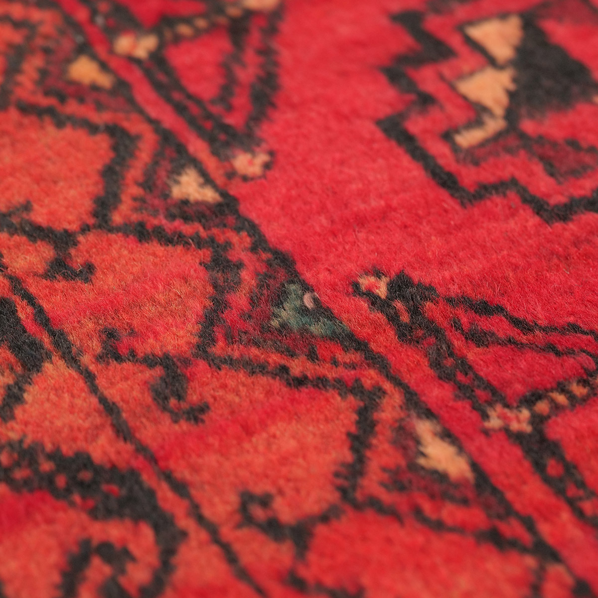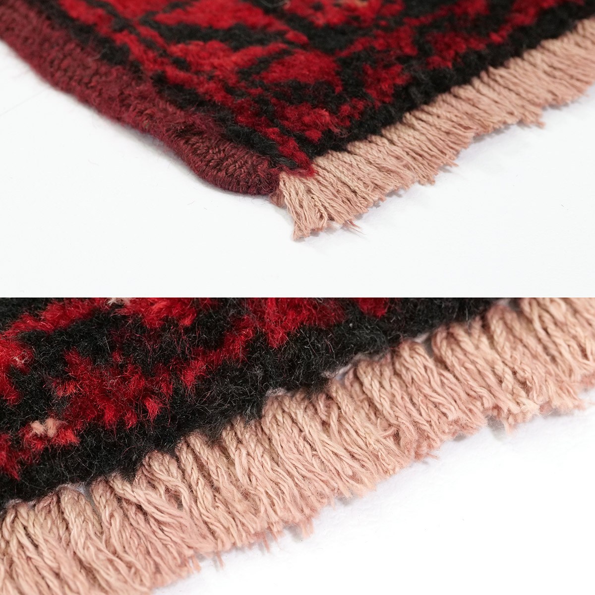 ボーダーには、小さな菱形パターンが連なる幾何学模様が施され、真紅と黒の配色が全体の調和を保ちます。バルーチ族の伝統的な意匠が感じられるデザインは、緻密なパターンと色使いが特徴です。