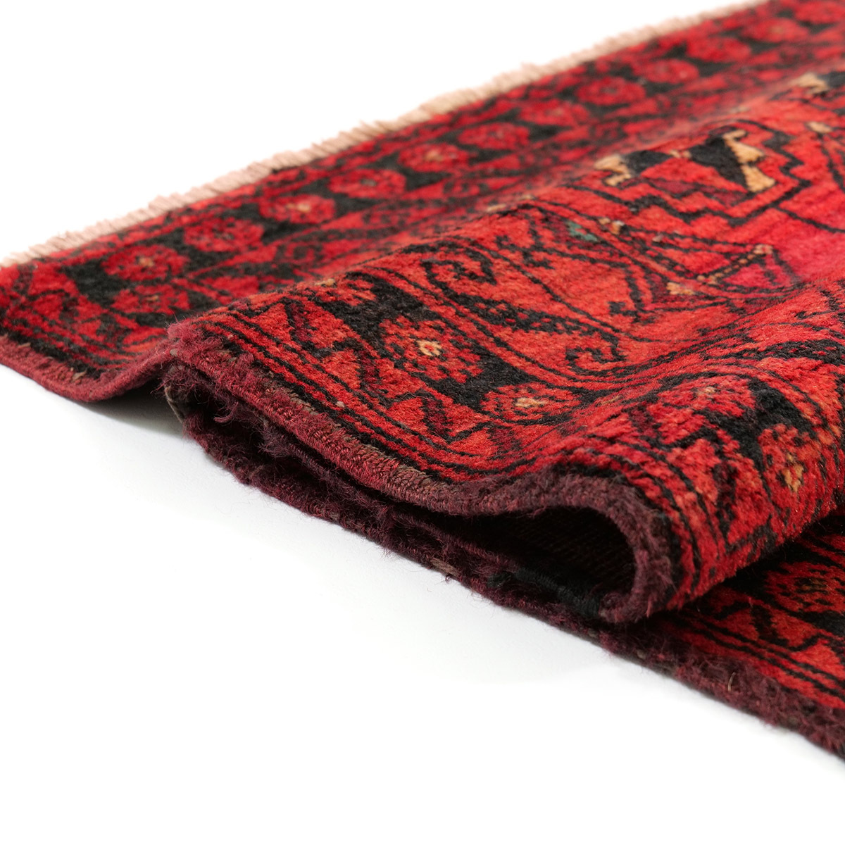 真紅と深紅を基調とした色合いは、アフガニスタン絨毯らしい力強い印象を与えます。黒、肌、緑、茶がテケギュル文様やボーダーに織り込まれ、繊細なコントラストが絨毯に深みを加えています。経年により真紅がやわらかな色調に変化し、セミアンティークならではの落ち着いた風合いが際立っています。緑のアクセントが、歴史的な雰囲気を引き立てています。