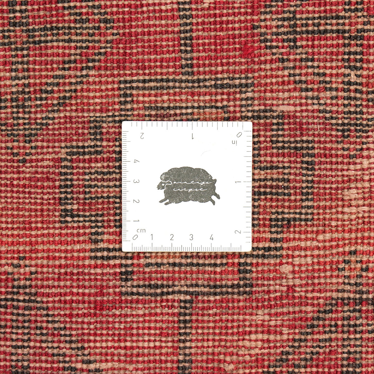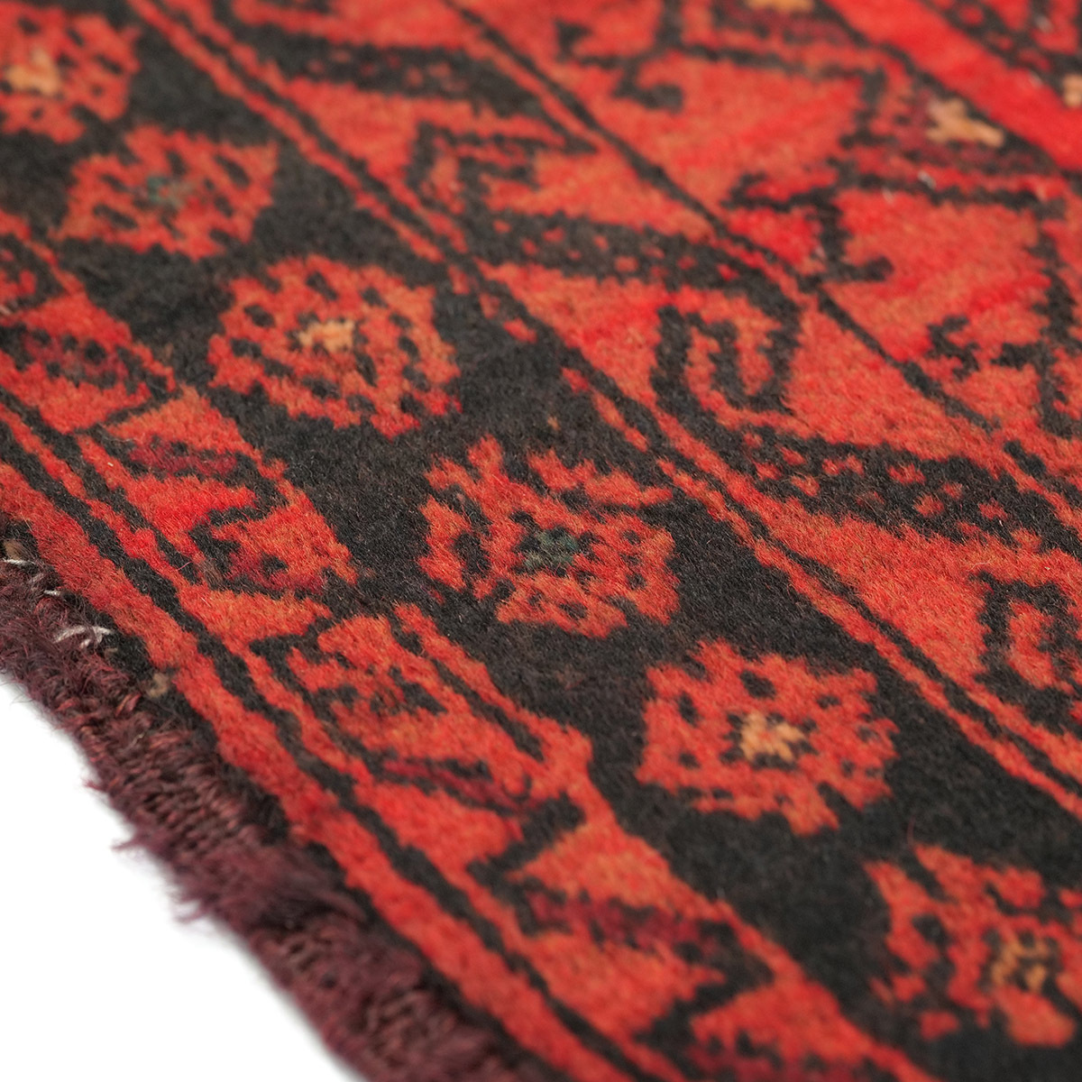 テケギュル文様が特徴的なデザインです。十字モチーフが並び、内部に象の足跡を思わせる幾何学パターンが細やかに織り込まれています。この文様は、バルーチ族の伝統的な意匠で、繁栄と強さを象徴します。真紅と深紅の背景に黒、肌、緑、茶のラインが鮮やかに映え、オレンジのグラデーションが彩りを加えています。モチーフの縁取りは丁寧に仕上げられ、伝統的な織りの技術がうかがえます。