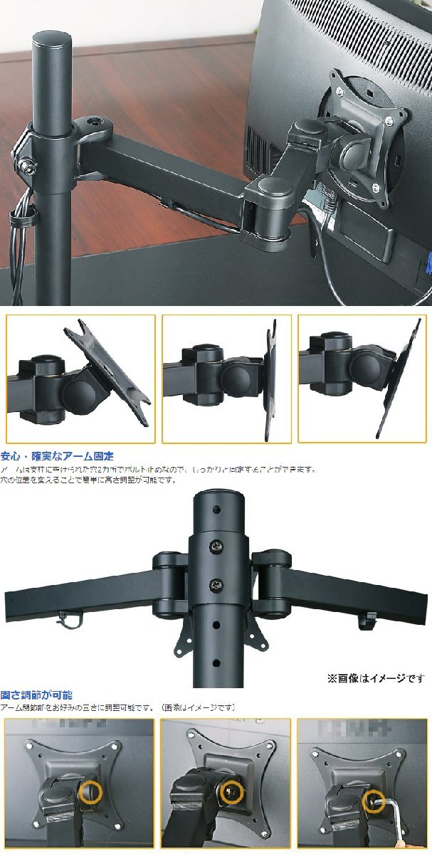 | 仕様 対応モニタサイズ 13~23インチ液晶モニタ VESA規格対応(ネジ穴距離) 75×75mm, 100×100mm 支柱高さ 725mm 材質 スチール 左右調整角度 360度 セット内容 モニタアーム本体・付属品・取付説明書(英語) ご注意事項 ※製造過程及び輸送途中での傷つき・塗装はげ・塗装むら・腐食等有る場合がございます。予めご了承ください。 ※モニターによっては、ワイド型・スクエア型の違いやフレーム幅等の違いにより、対応インチサイズであっても取り付けできない場合もございます。必ず取り付け予定のモニターサイズをご確認の上、ご注文ください。 ※ご使用のモニター解像度、カラー調整などにより画像と商品の色合いが異なる場合がございます。 ※事故防止の為、各部のネジを増し締めしてご利用ください。 |