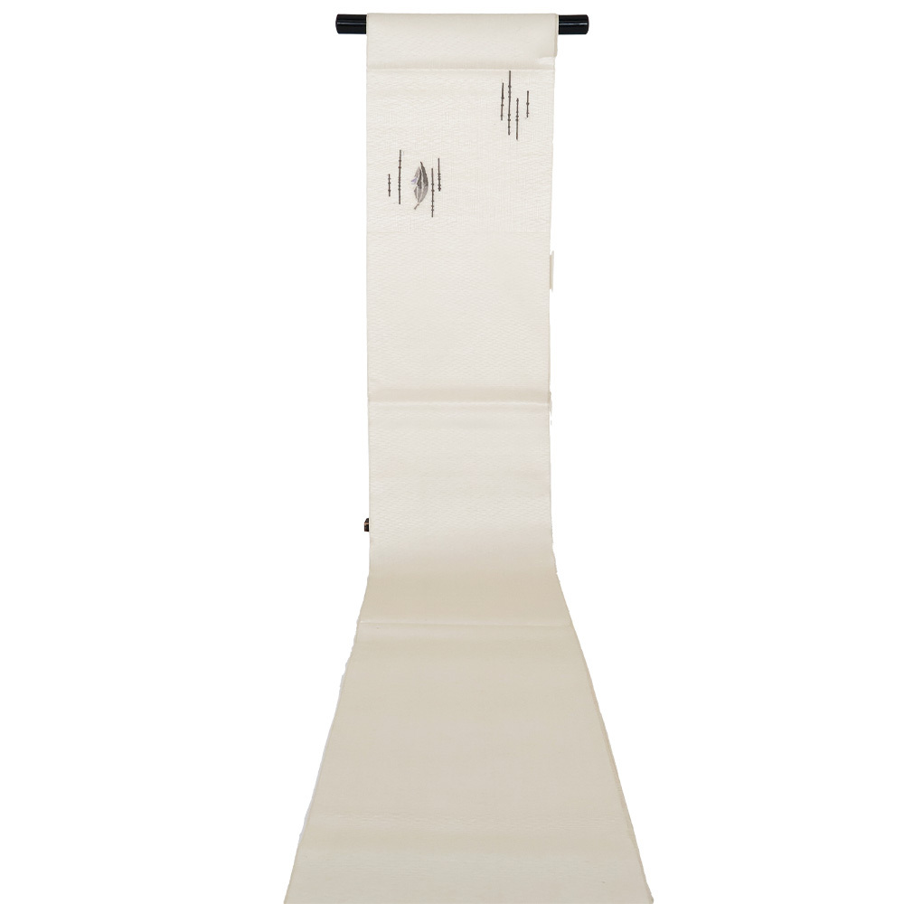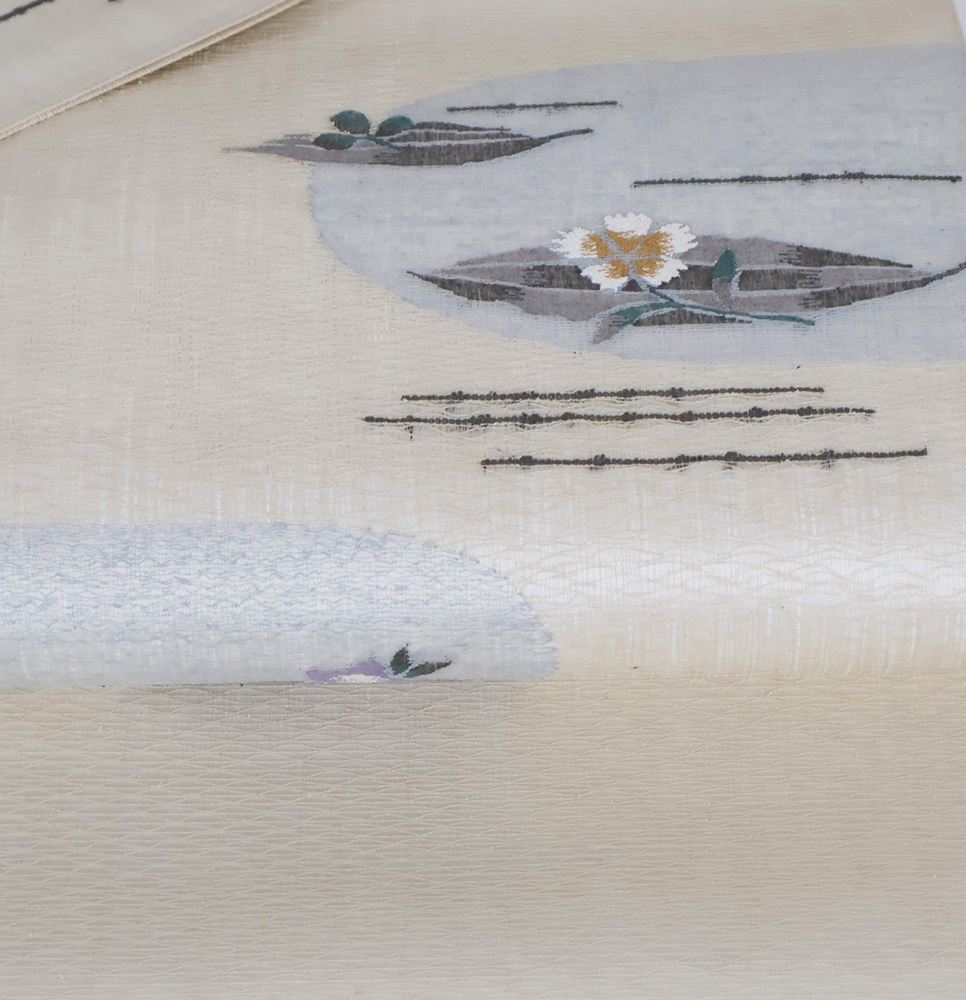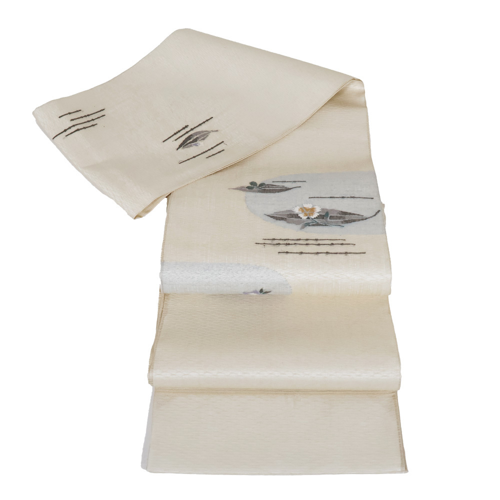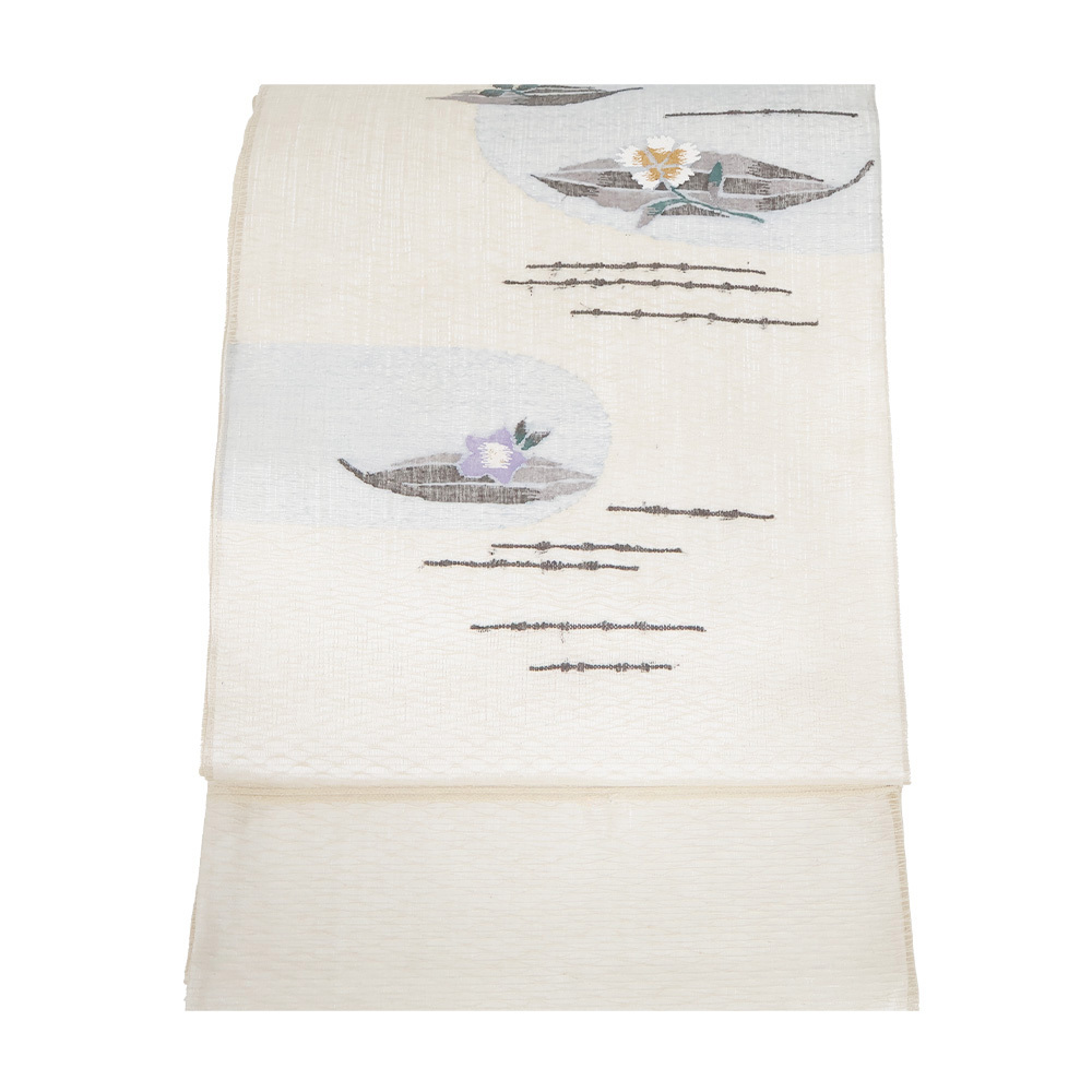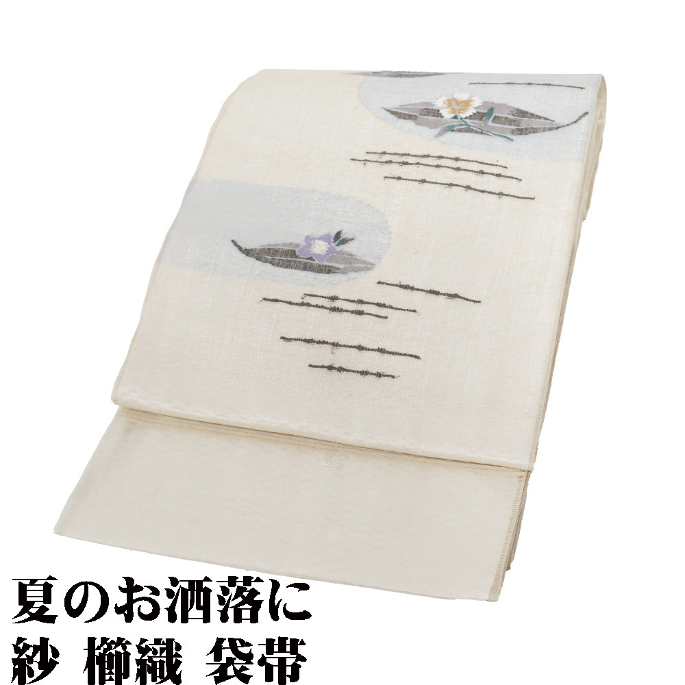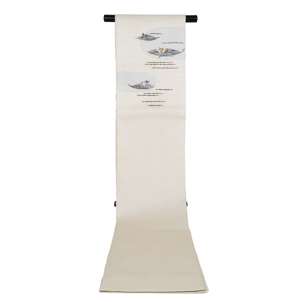 | 紗 櫛織 袋帯 ベージュ地 花筏 桔梗・撫子・南天 新品 仕立て上がり | |