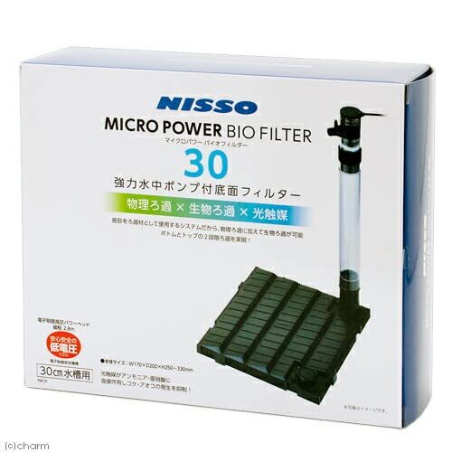 商品紹介30cm水槽用。水中ポンプ付き底面フィルター。底面と光触媒付き水中フィルターの2段階ろ過を実現。使用上の注意本品は屋内用です。屋外では使用できません。水入れが完了する前に通電(空運転)しないでください。細かな砂を吸い込むと、故障の原因となります。ご注意ください。原材料・成分ABS,AS,PVC,銅,ポリエステル,エラストマー,TiO2+微量成分使用方法キレイに洗った砂利等を4~6cm位敷いて設置して下さい。水槽にセットする場合や掃除の時などは必ず、水槽用電気器具の全ての電源プラグを抜いてから行ってください。ご注意(免責)>必ずお読みください本品は観賞魚飼育専用です。他の目的では使用しないでください。水槽にセットする場合や掃除の時などは必ず、水槽用電気器具の全ての電源プラグを抜いてから行ってください。