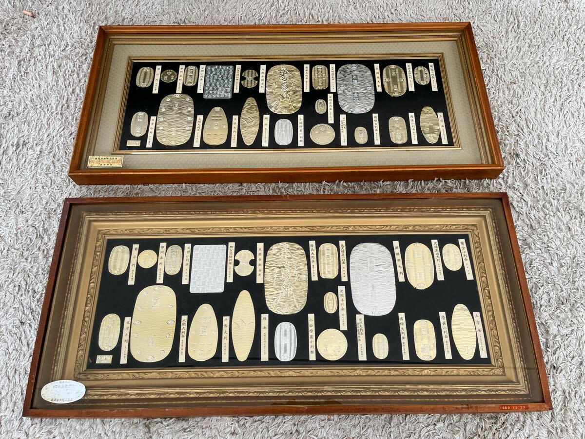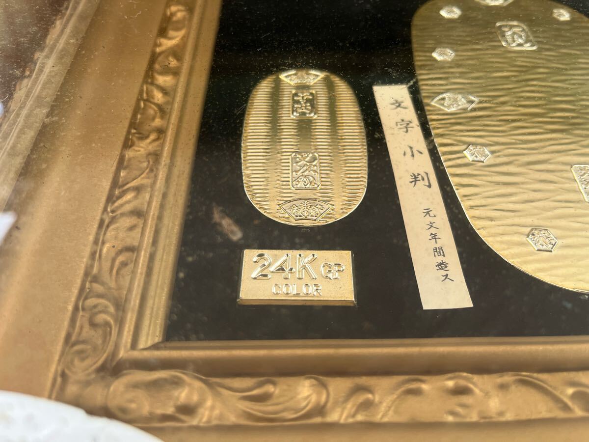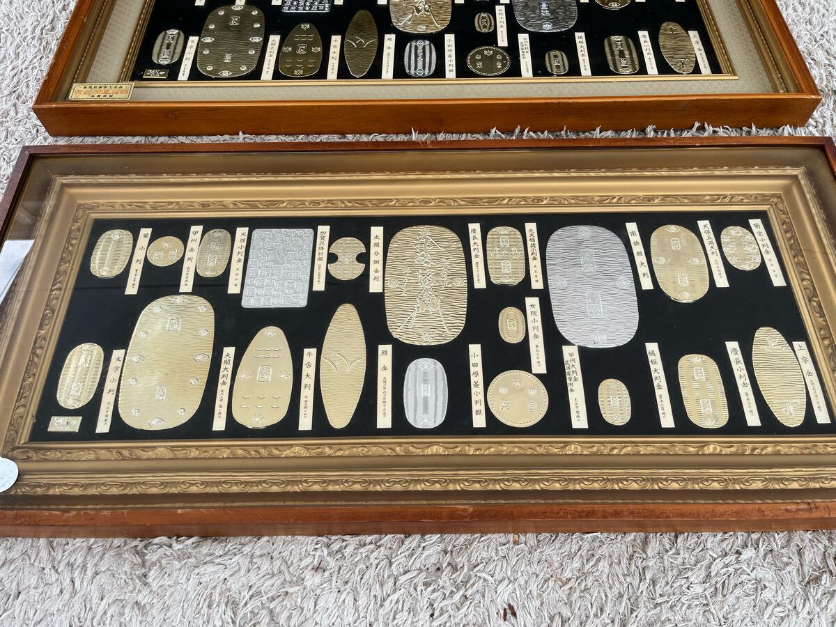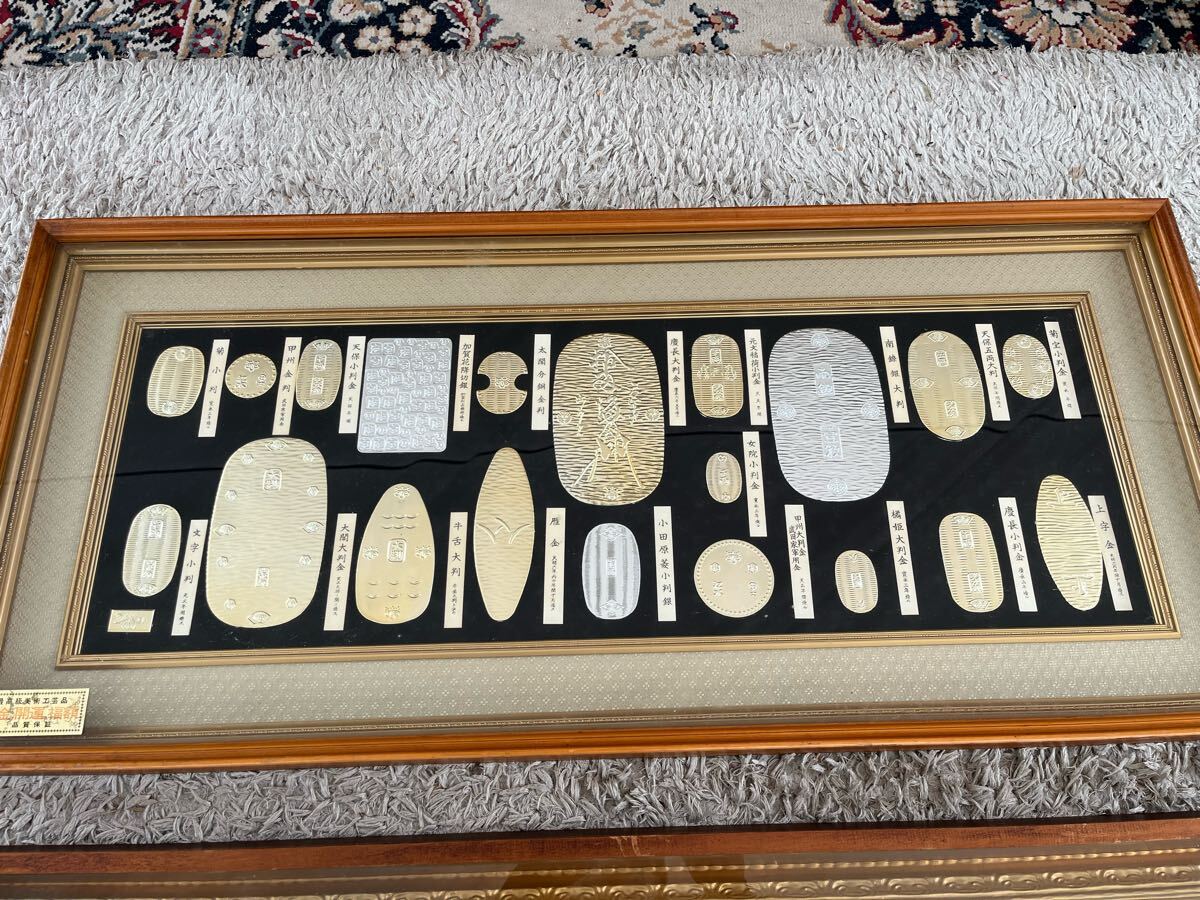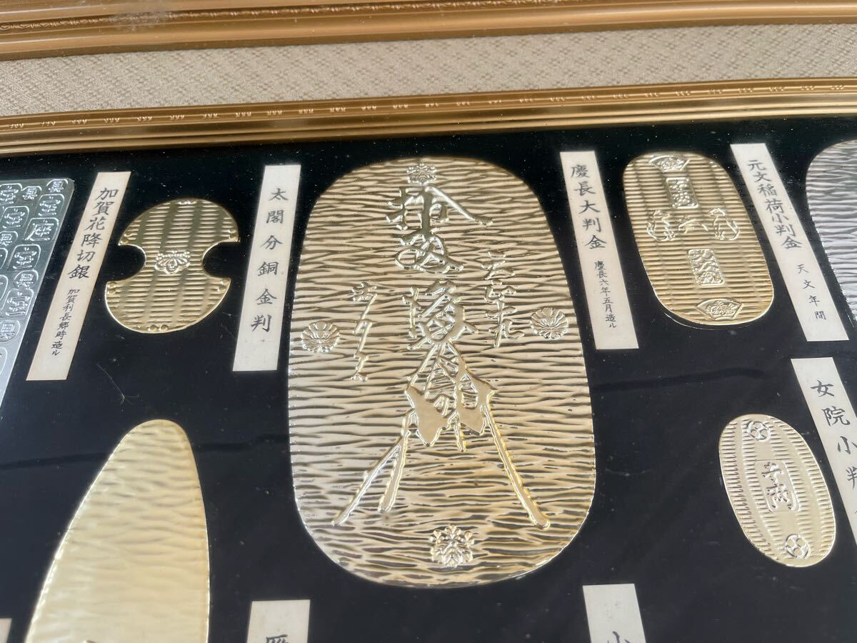 日本の歴史的な貨幣である大判(おおばん)や小判(こばん)のレプリカが額装されたもの。