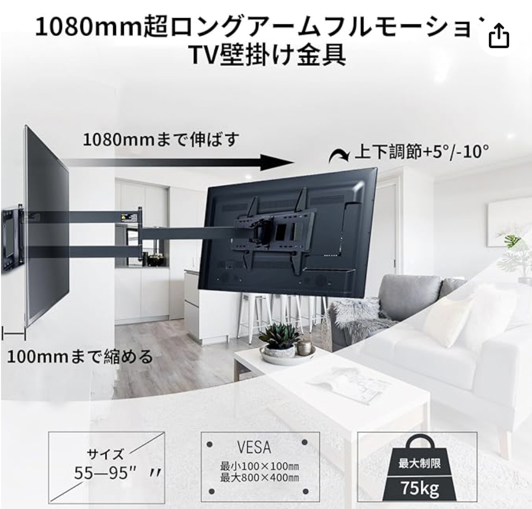 FORGING MOUNT ロングアーム テレビ壁マウント フルモーション 壁マウント テレビブラケット 108cm延長関節アーム付き ユニバーサルテレビマウント 55〜95インチ対応を出品します。