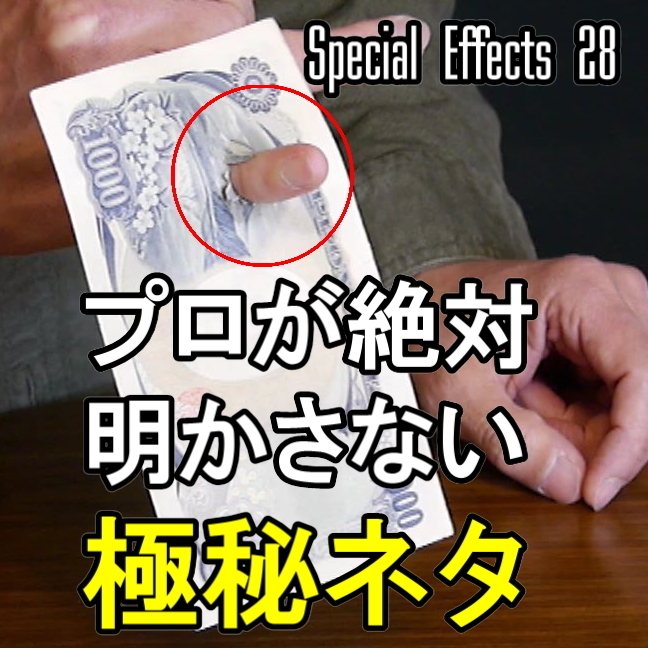 一方、S28はプロが実際に演じている方法でありギミックが不要なので、この方法さえ知ればあなたは一生これを演じ続けることが出来ます。何といっても、千円札でも五千円札でも一万円札でも演じられるのが強みです。ただし演じる前に紙幣を加工する細かい作業が必要ですので、不器用な方や面倒くさがりの方にはお勧めしません。単に「プロはこんなすごい方法で演じてるんだ!」と感激したい方には強くオススメします。