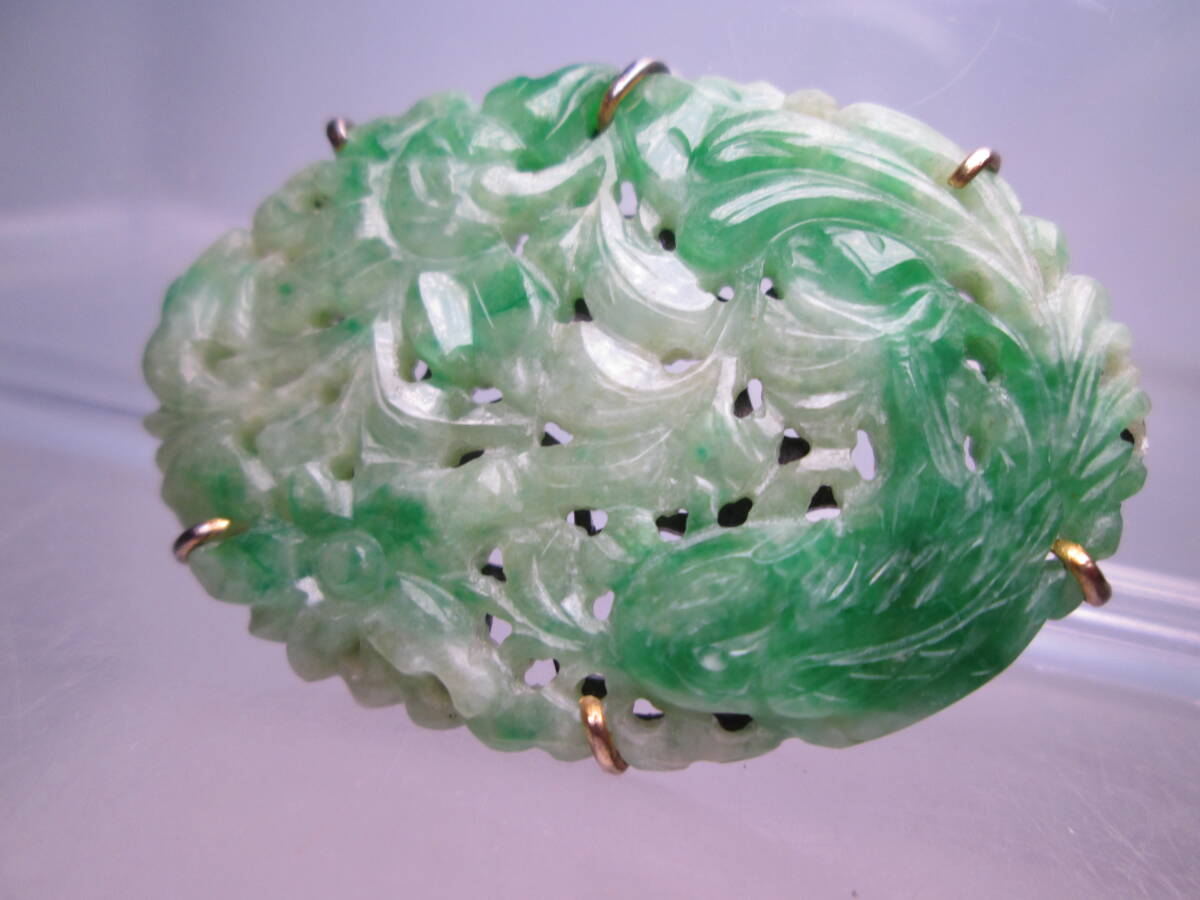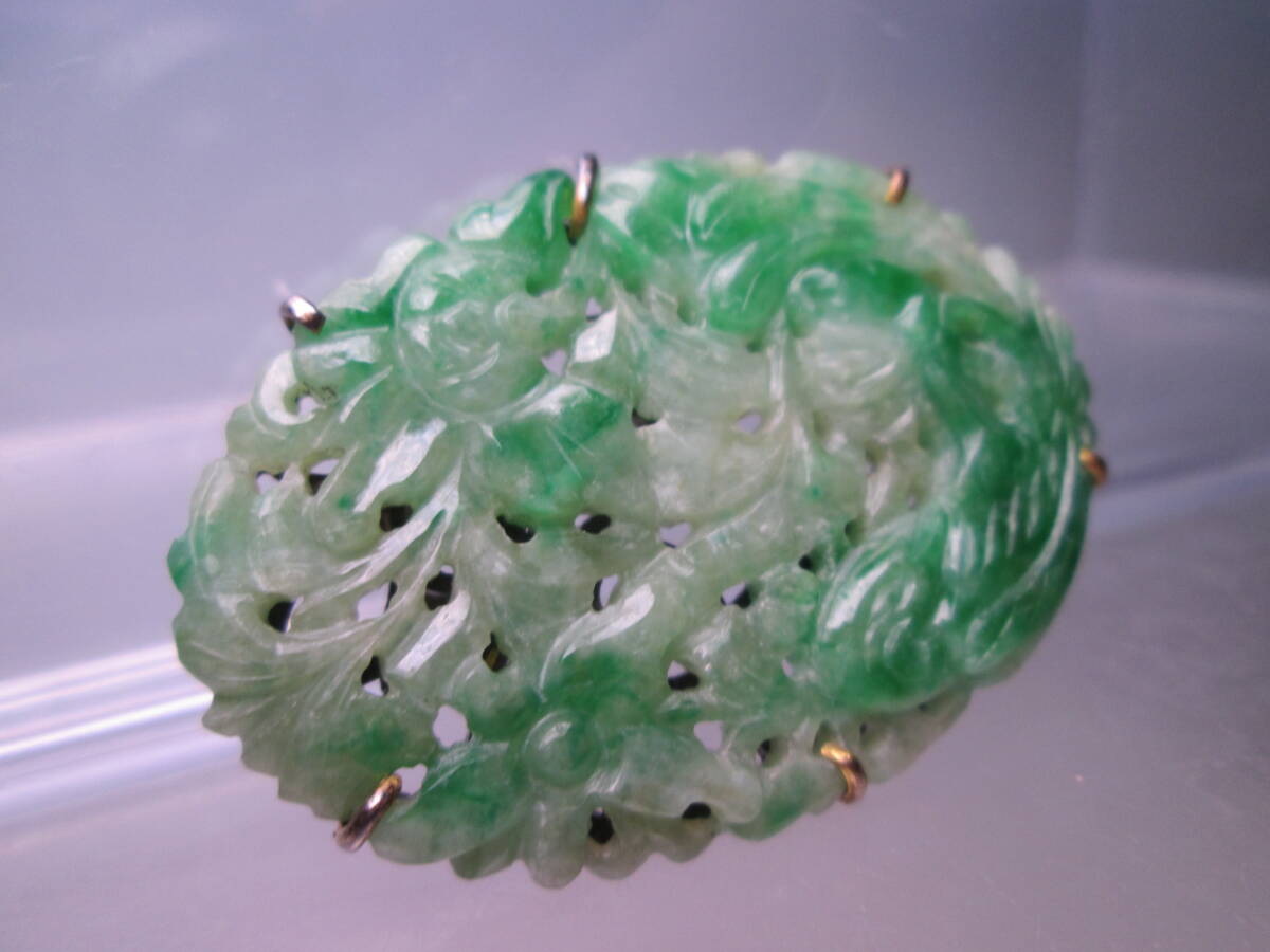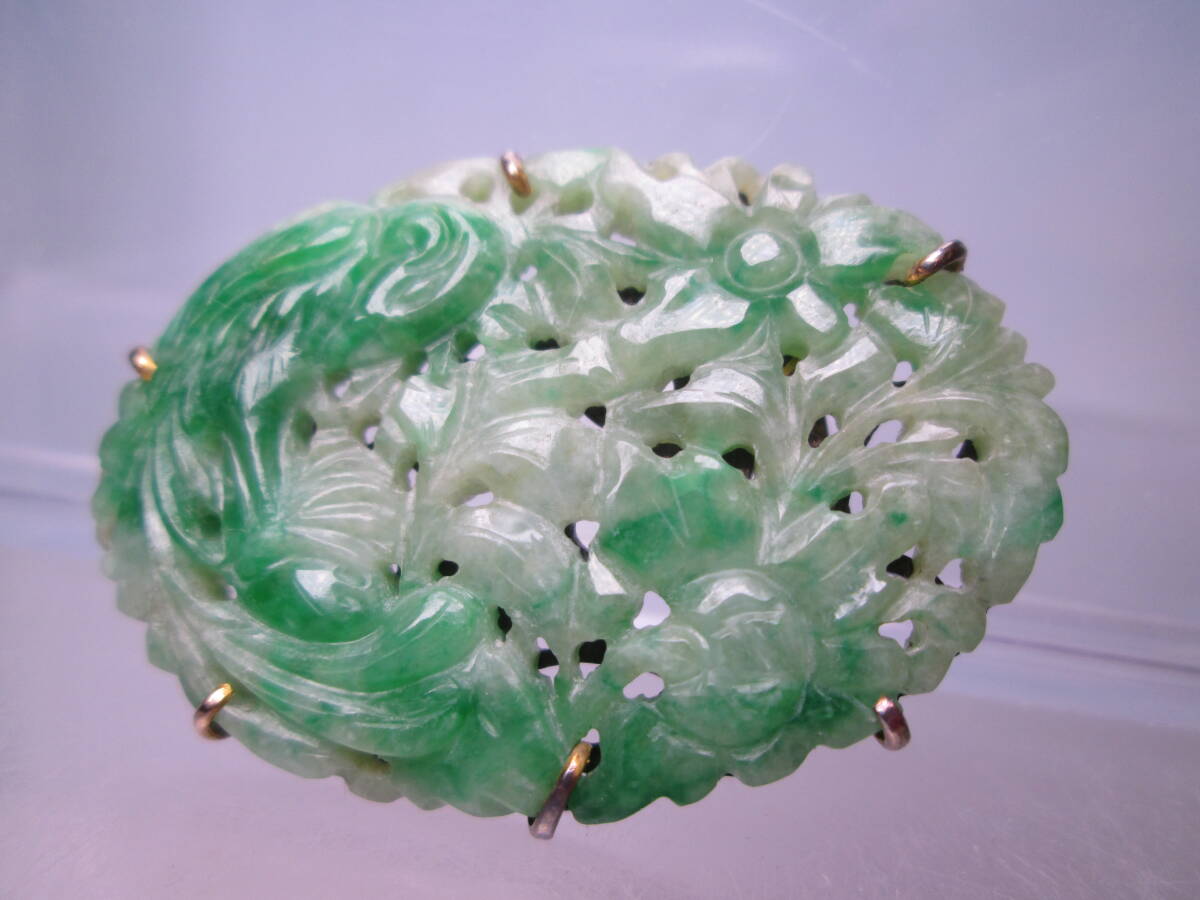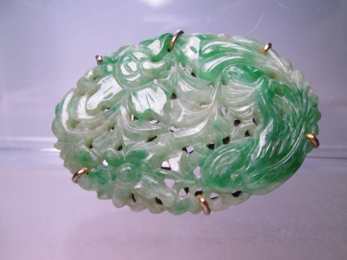 【江月】 アンティーク・本翡翠 鳳凰に花透かし彫刻の帯留め 11,9g