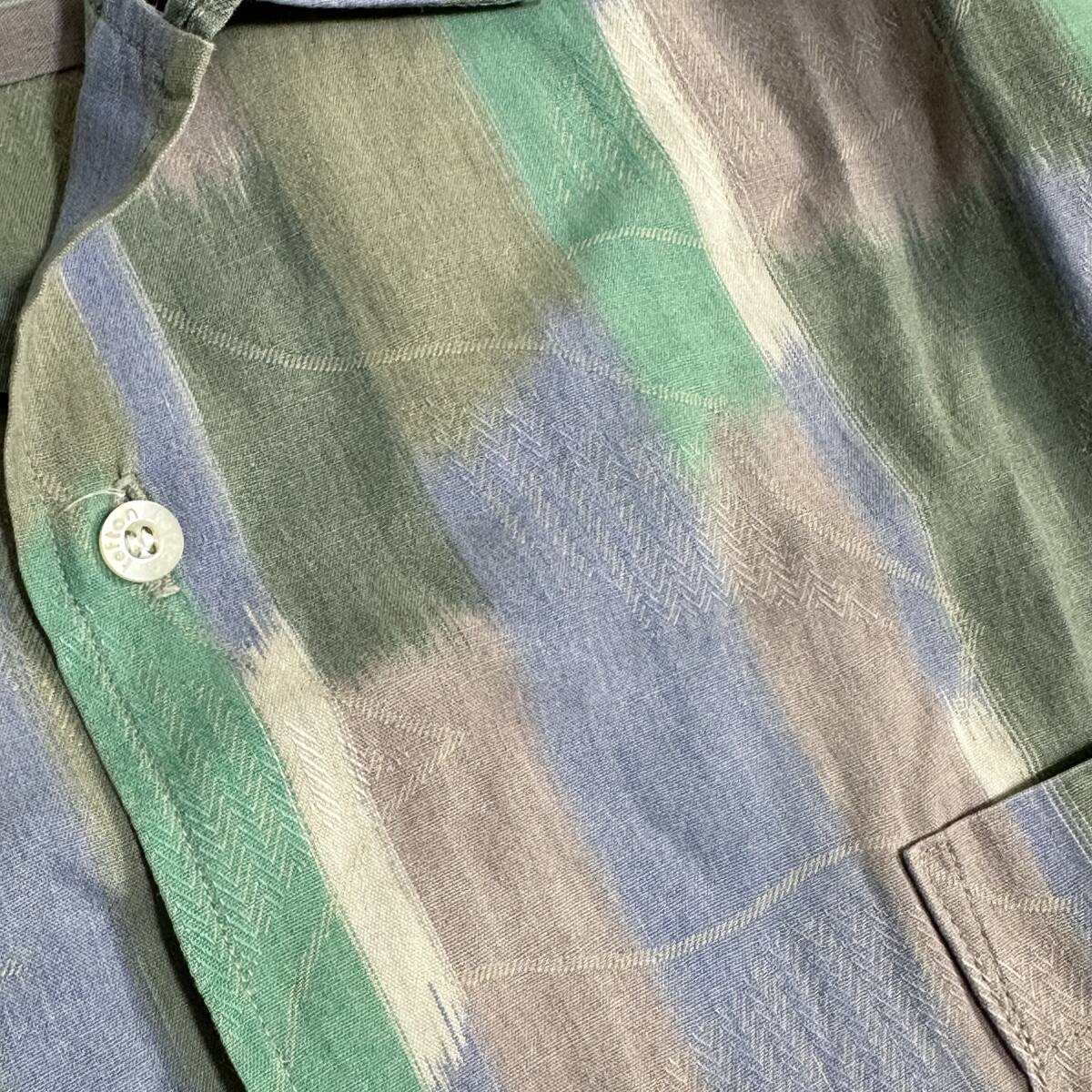 淡いトーンカラーをミックスしたグラフィックデザイン柄が秀逸なレトロビンテージオープンカラーシャツ