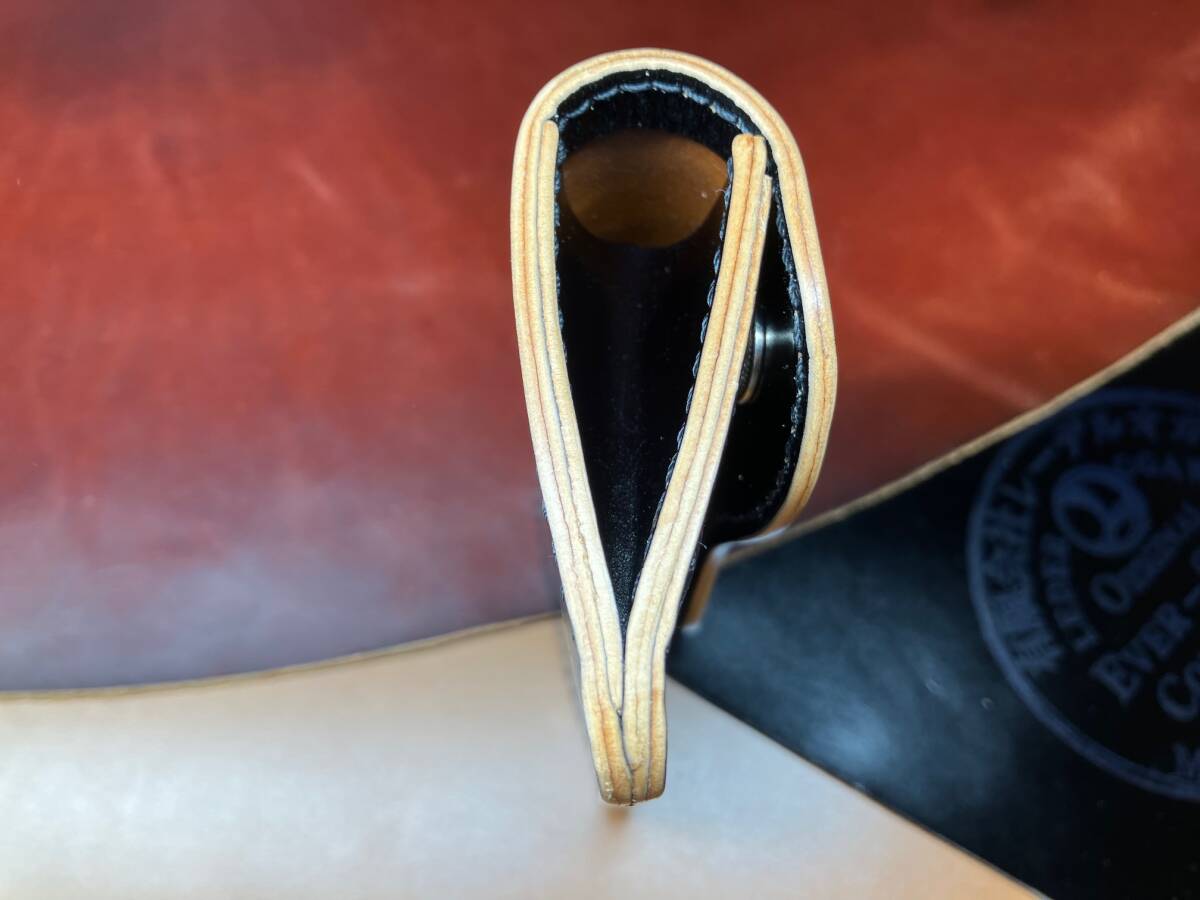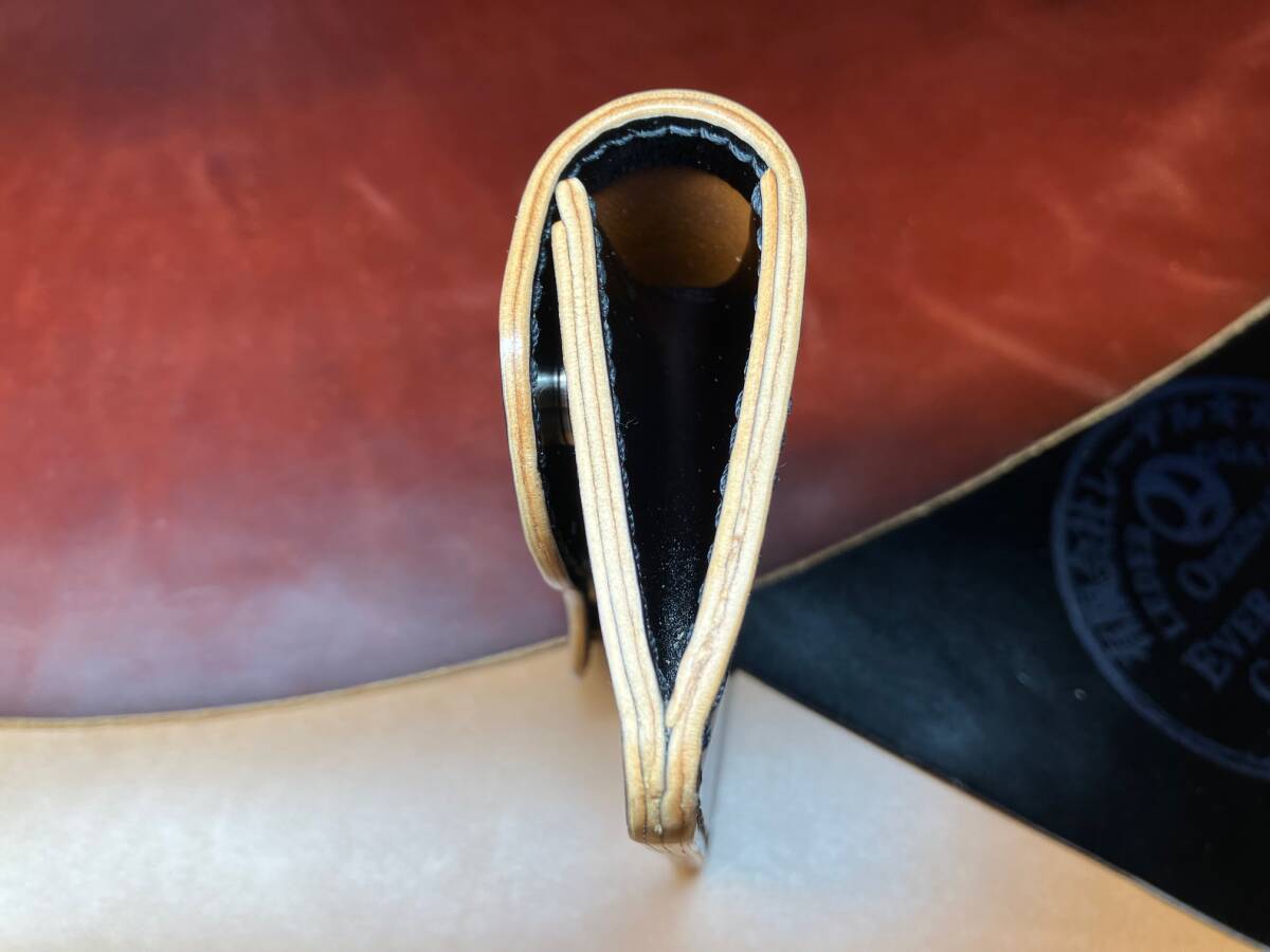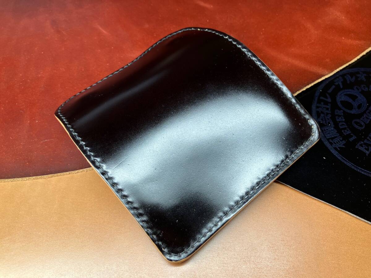 レーデルオガワ社製のコードバン(茶芯ブラック)は、下地にブラウンのオイルコードバンを用い、その上からブラックを重ねて染色した茶芯仕上げが特徴です。