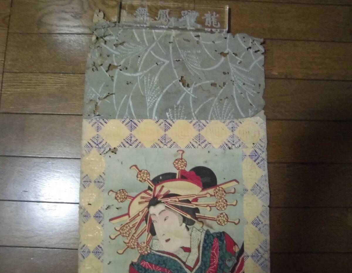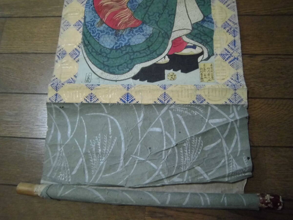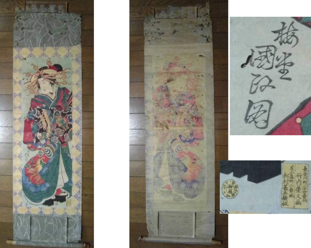 古い 掛軸 木版画 浮世絵 縦二枚続 梅堂国政 四代歌川国政 役者絵 美人画 日本画 大判 美術品 時代物 レトロ