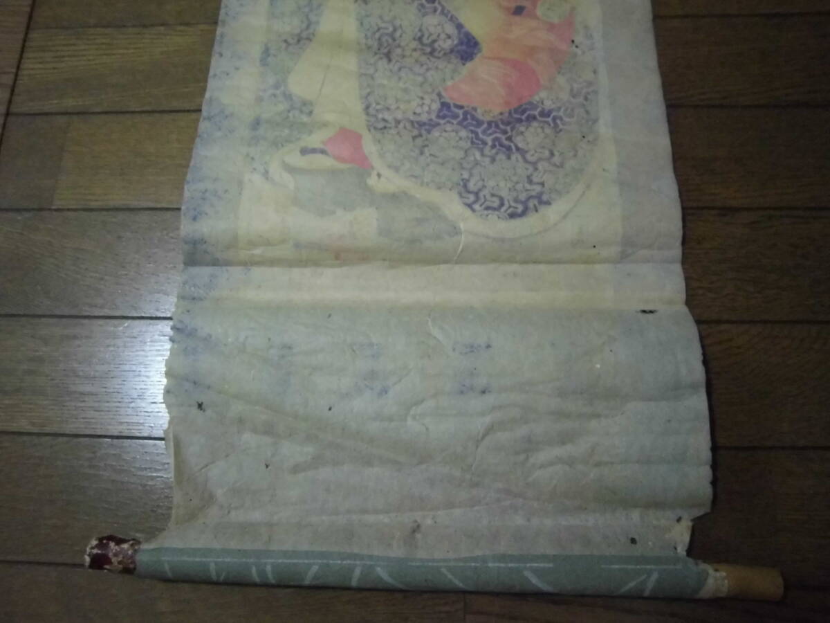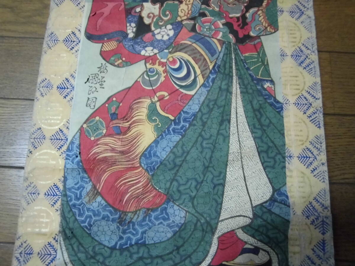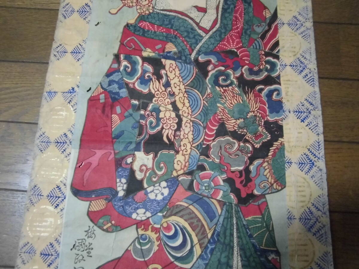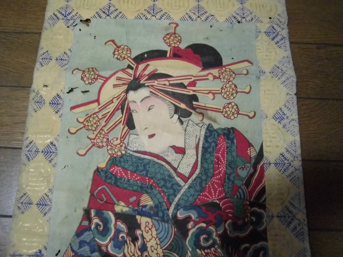 古い 掛軸 木版画 浮世絵 縦二枚続 梅堂国政 四代歌川国政 役者絵 美人画 日本画 大判 美術品 時代物 レトロ