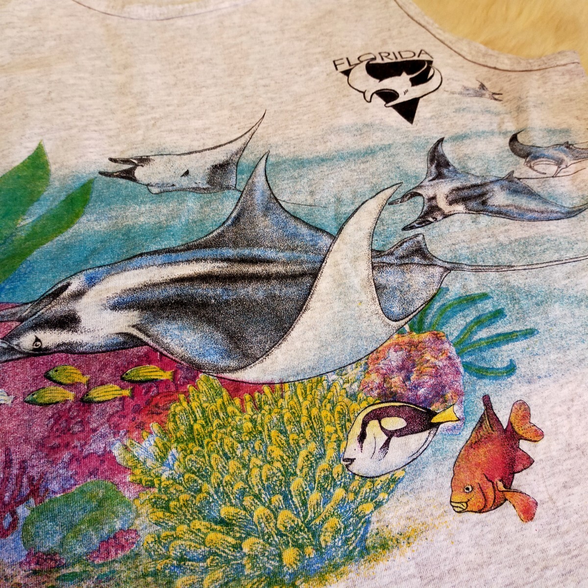 カラーは杢グレー、フロント、バックの両面にプリントデザインが入っています。