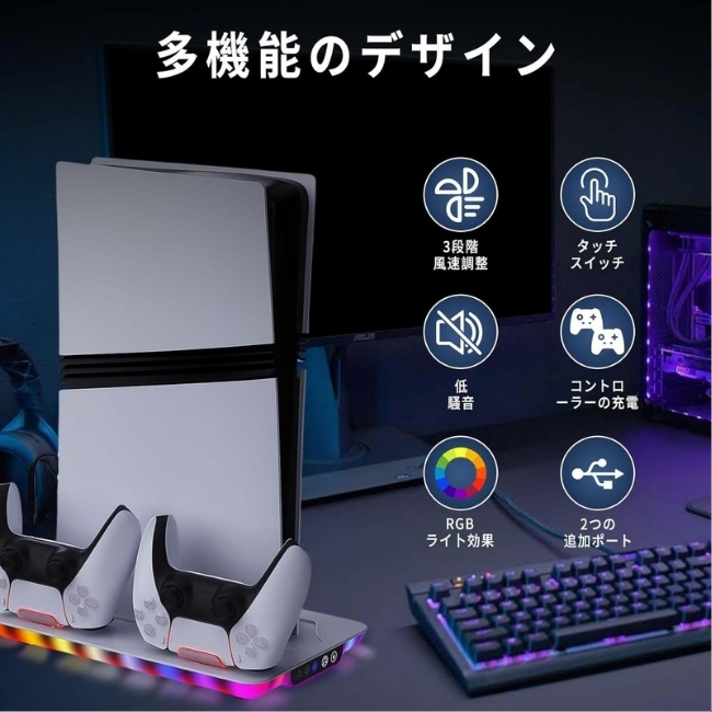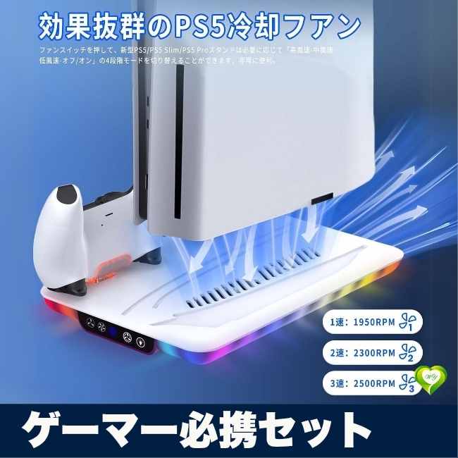 | ご覧いただきありがとうございます。 商品名:PS5 Pro/PS5/PS5 Slim 縦置きスタンド 3in1 冷却+充電+収納 【この商品が品質で選ばれる理由】 PS5全機種対応で、強力な冷却機能と豊富なRGBライト、複数同時充電で、快適かつスタイリッシュなゲーム環境を提供します。 ■こんな悩みありませんか? ・大切なゲーム機を傷や汚れから守りたい ・ゲーム機のデザインを損なわずに保護したい ・友達へのプレゼントで何を選んだらいいか悩む ★こんな時におすすめ! ・新しいゲーム機をすぐに保護したい時 ・ゲーム機のデザインを気分に合わせて変えたい時 ・ゲーム好きの友人への贈り物を選ぶ時 ------------------------------------- 【商品特徴】 ★PS5/PS5 Slim/PS5 Pro対応 ・PS5/プレステ5 Pro/PS5 Slimホストディスク通常版/デジタル版に対応。 ・PS5 Slim本体の放熱や、PS5オリジナルハンドルの充電に最適。 ・ヘッドセットフック収納スペースがあり、省スペースで収納可能。 ★3段階速度調整のPS5 冷却ファン ・内蔵ファンがPlayStation 5 Pro本体下部の空気循環を加速し、効果的な放熱を実現。 ・ファンスイッチで「高風速-中風速-低風速-オフ/オン」の4段階モードを切り替え可能。 ・風速段階が切り替わると、対応するファンアイコンが青色に点灯し、風速を明確に確認できます。 ★2つのUSB追加ポート ・ps5pro/PS5 Slim本体USBポートから給電し、スムーズに設置可能。 ・データ転送や他のデバイスへの接続に使える2つのUSBポートを搭載。 ・マウス、キーボードなどの外部デバイスにも接続できるデータ拡張インターフェース。 ★10種類のRGB光効果 ・雰囲気灯タッチスイッチ付きで、10種類のRGB照明効果を切り替え可能。 ・短く押すたびに「赤、緑、青、紫、青、黄色、七色快呼吸、七色徐呼吸、走馬、ストリーマ」の10種類のモードを回転調整。 ・好みに合わせて切り替えられ、より興味深いゲーム体験を提供します。 ★2台同時充電 & LEDインジケーター ・純正PS5コントローラーを2台同時に充電可能。 ・ベースに2つの専用TYPE-Cヘッドを配置し、2つのハンドルを同時に充電でき、充電効率が向上。 ・充電LEDでリアルタイムの充電状態を表示(橙色:充電中、青色:充電完了、消灯:待機中)。 ★安定性抜群 ・過電圧、過電流、過熱、短絡などを防止する保護回路を搭載。 ・PS5/PS5 Slim/PS5 Pro本体をしっかり固定し保護するための固定ネジが付属。 ・安全で信頼性が高く、安心して使用できます。 ご不明な点がございましたら、お気軽にお問い合わせください。 |