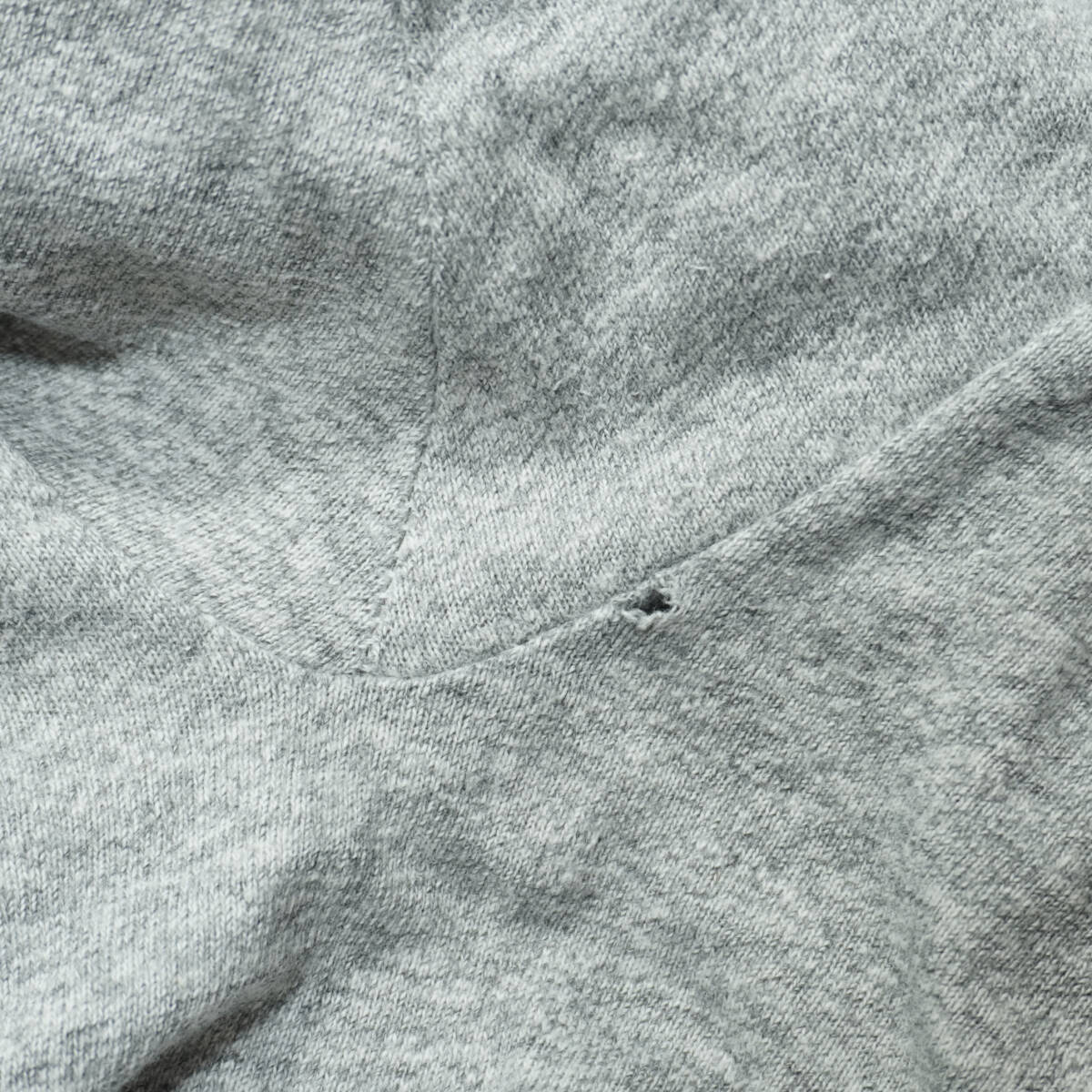 左肩にリペア、前身頃の左脇腹に小さい汚れ、右前身頃の裾に小穴、右袖に小穴、左袖脇に小穴があります。
