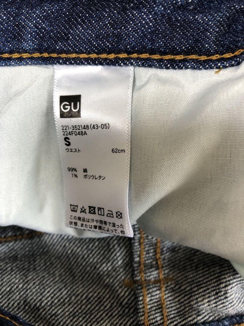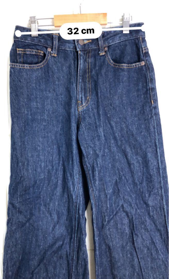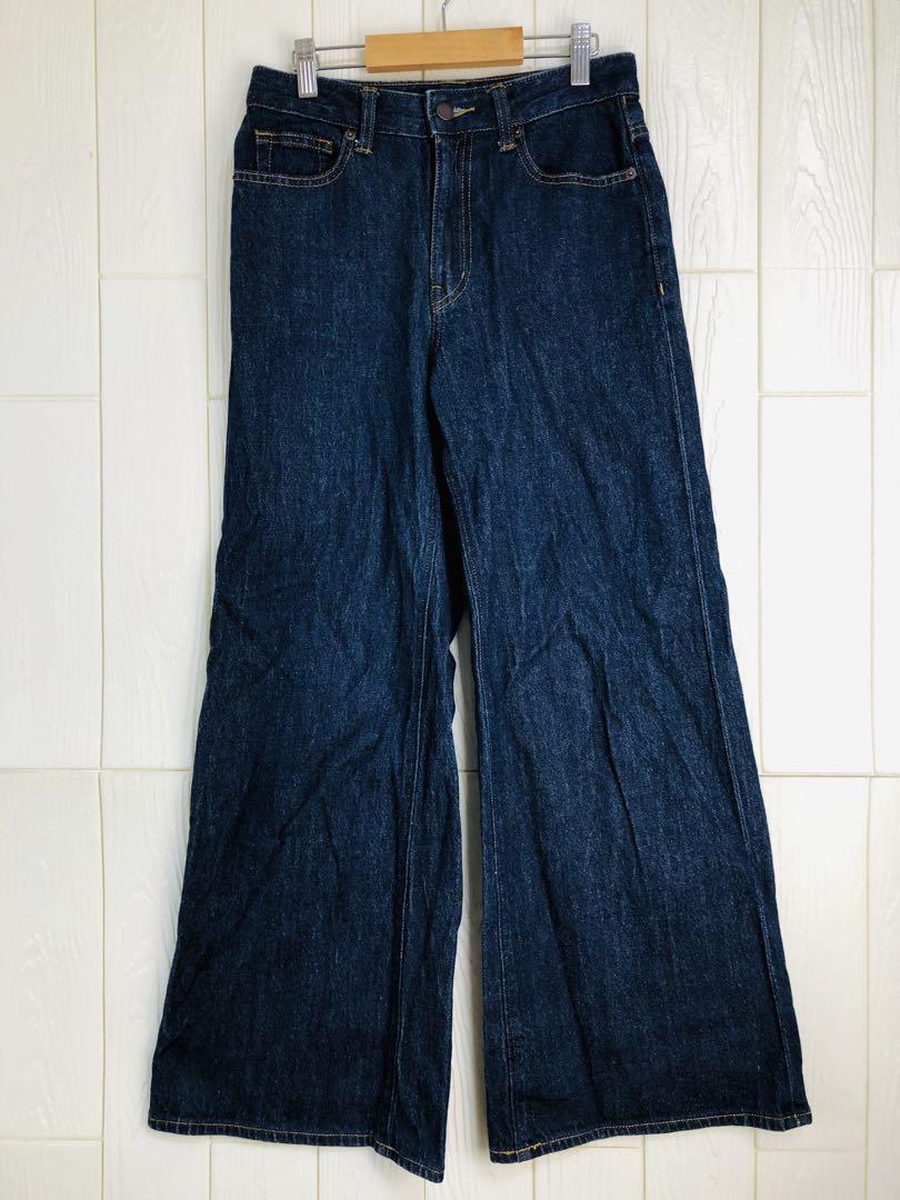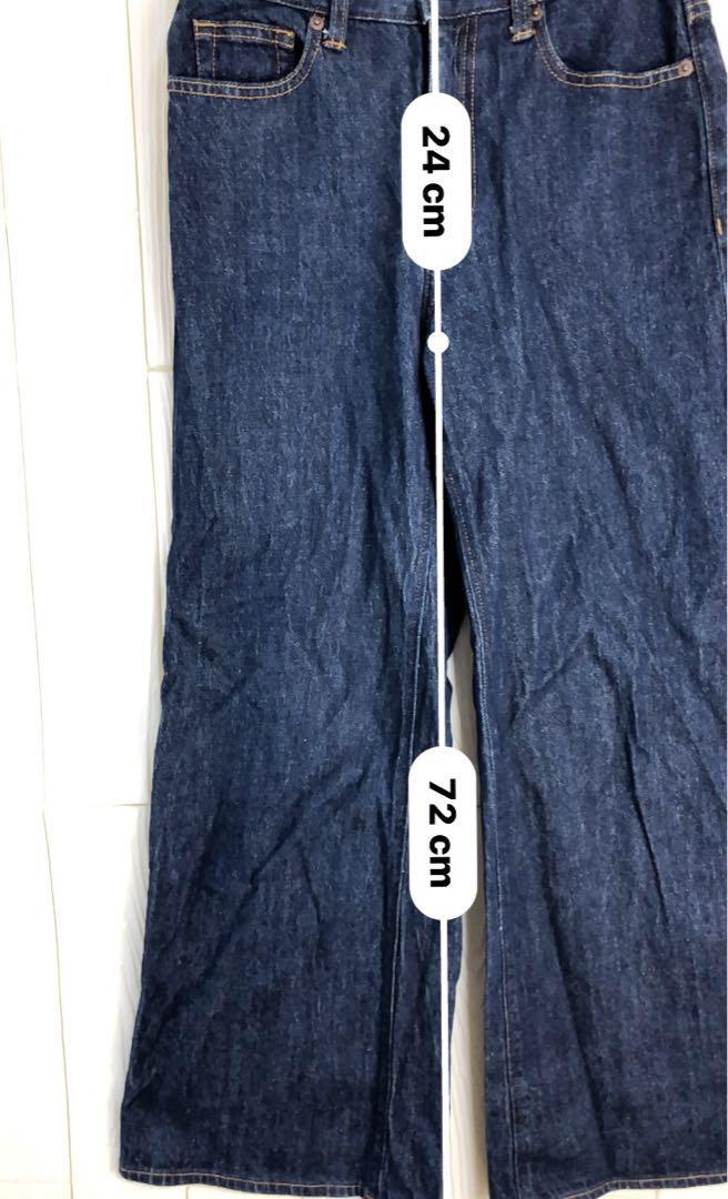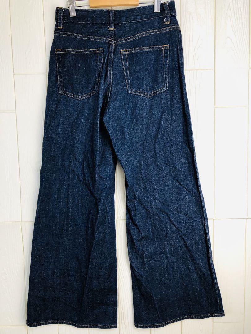ダークブルーのブーツカットデニム、ウエスト64cm、股下72cm。