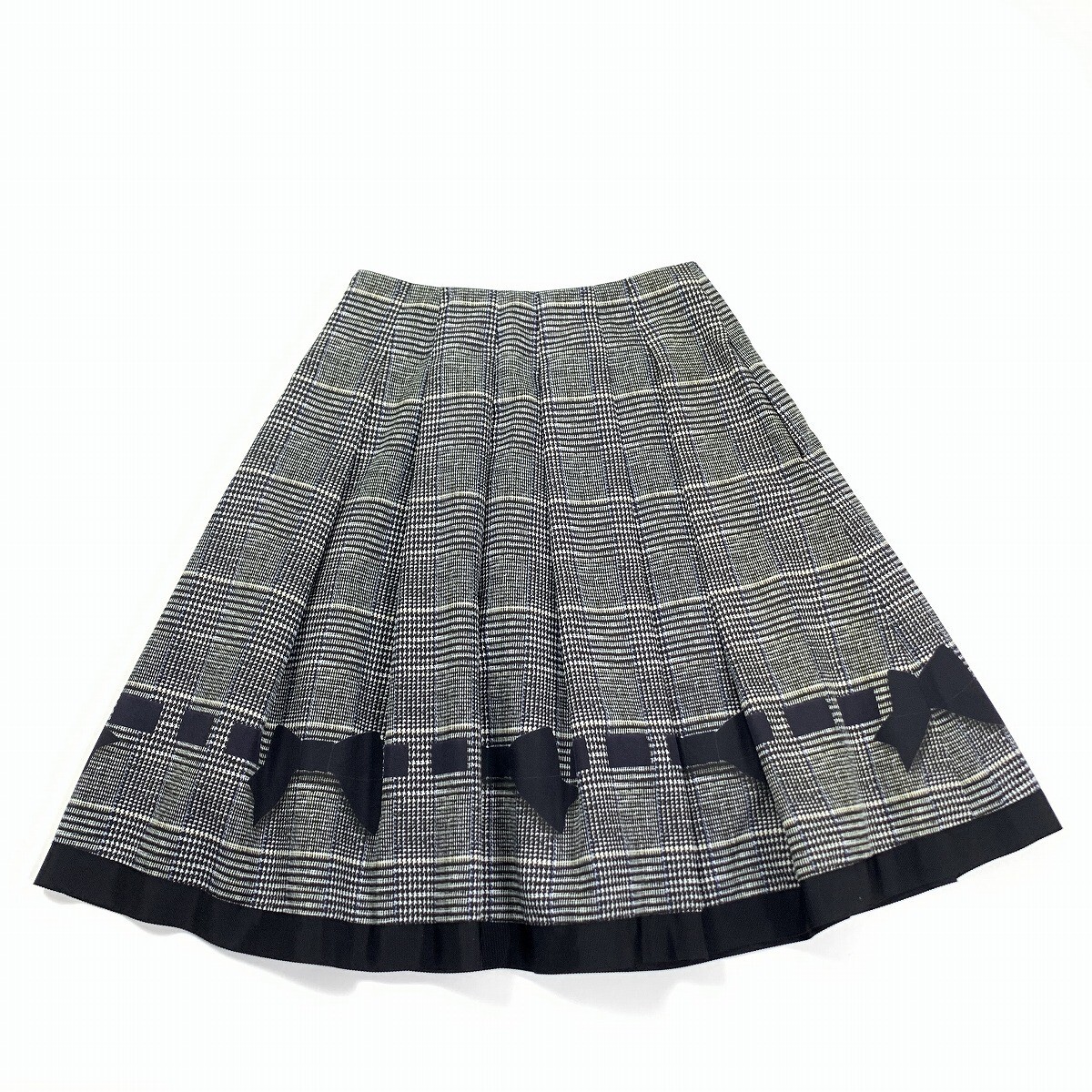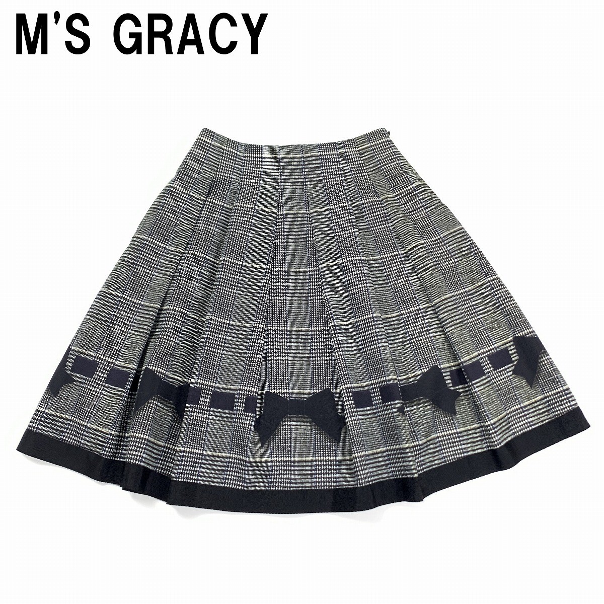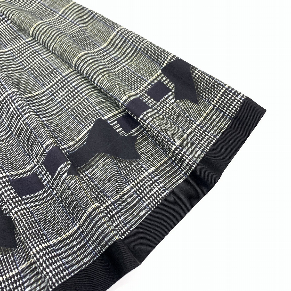 M'S GRACY エムズグレイシー ひざ丈スカート フレア 裏地あり チェック リボン 黒 グレー ブラック 36 YC487