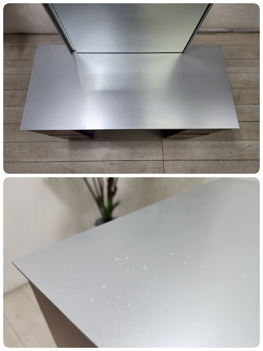 角度が変えられる左右の鏡は、正面の鏡に収納することが出来、トップは美しいアルミニウム・アルマイト仕上げ、モダンなベッドルームやインテリアに対応できるアイテムになります。