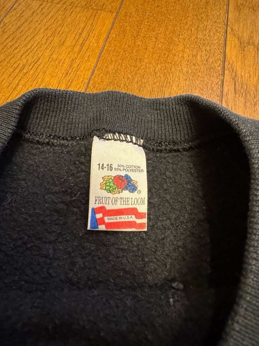 フルーツオブザルームのヴィンテージスウェットです。色はブラックで黄色のプリントが入っています。おそらくですが、60〜70年代くらいのものだと思われます。※間違っていたらすみません。