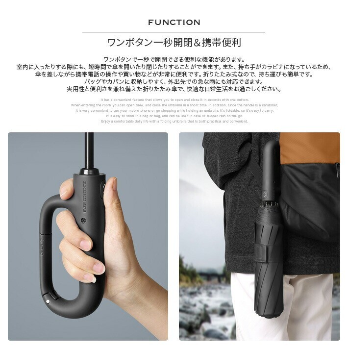 ワンボタンで一秒で開閉できる機能があり、急な雨や室内への入退時に素早く対応できます。持ち手にカラビナを採用しており、両手を自由に使えるため、傘を差しながらの携帯電話操作や買い物に便利です。折りたたみ式で、コンパクトに収納でき、バッグやカバンに簡単に入れられます。