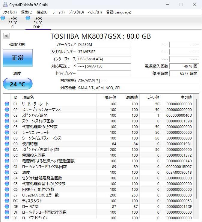 【正常判定】TOSHIBA MK8037GSX 80GB 6577時間使用 (管理番号 T-67)