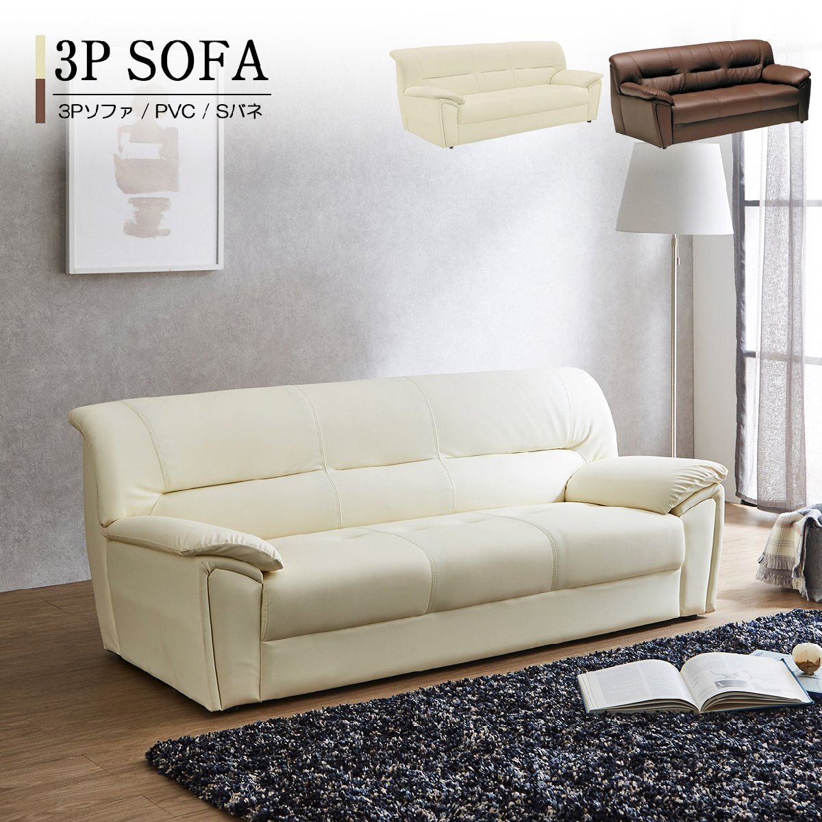 リビングソファ 3人掛けソファ 三人用ソファ 合皮レザー 合成皮革 シンプル モダン 肘付き トリプル 安い お得 アイボリー ホワイト