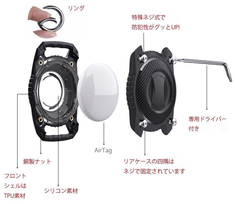 【 パッケージ】:ネジ*8、L字型ドライバー*2、AirTagケース*2、取り扱い書*2。